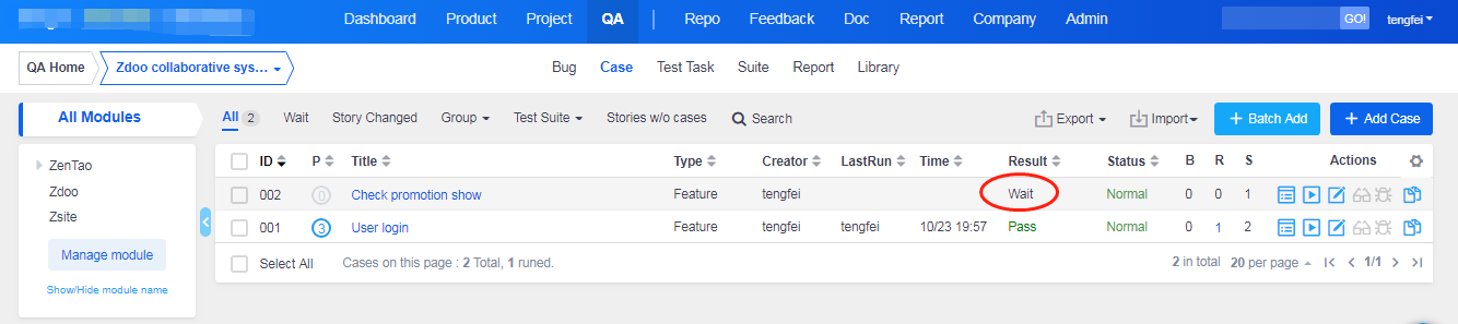 Once Review is ON, the page of Add Case looks the same as before. The difference is that the test case status is Wait after it is created.