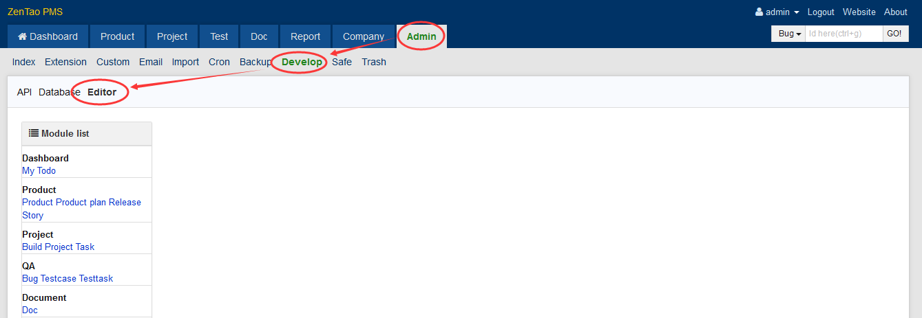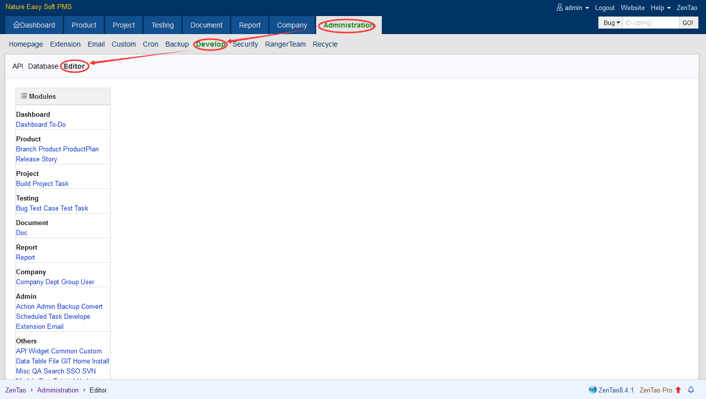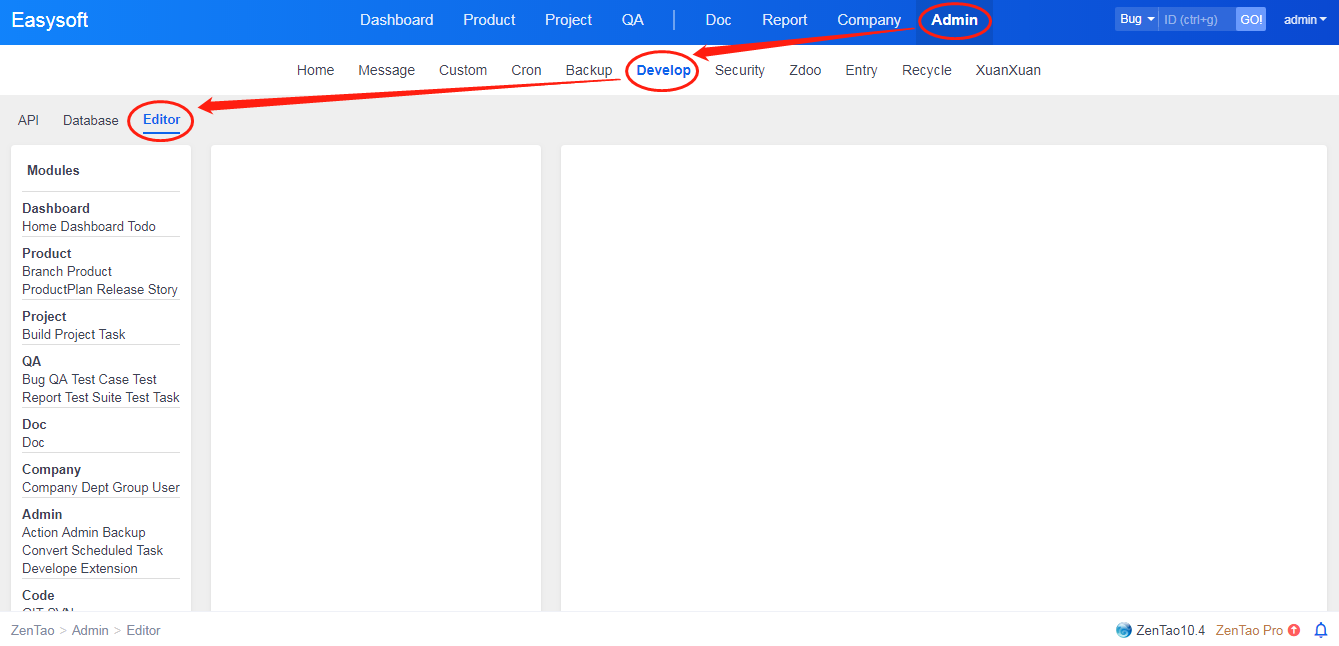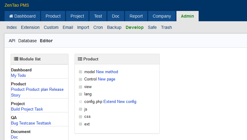 ZenTao has a code editor. You can log in ZenTao as a super administrator to develop.