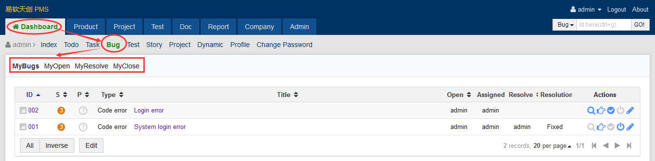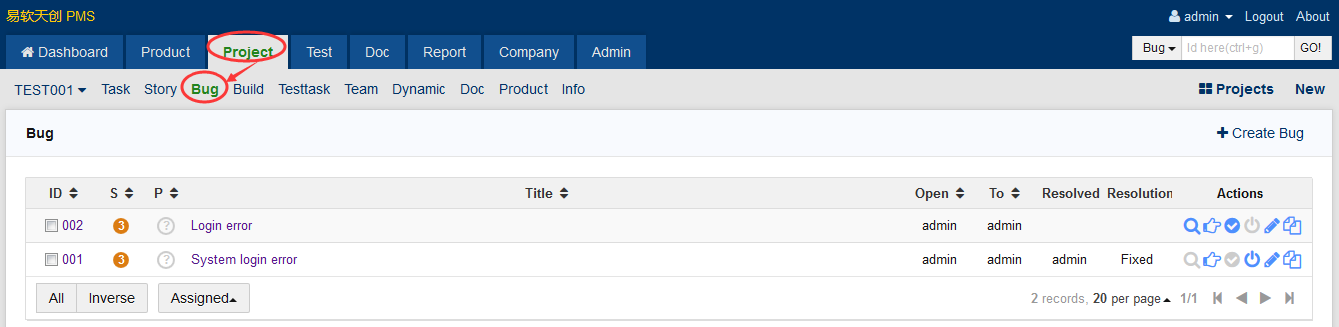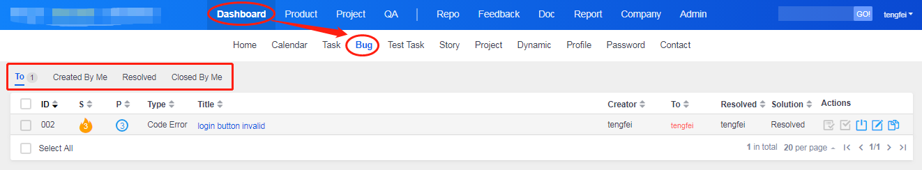 Bug lists on Project page are the bugs reported in this project. All the team members can view bugs on this page.