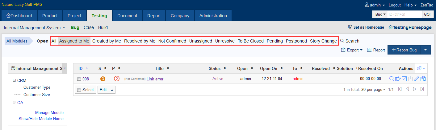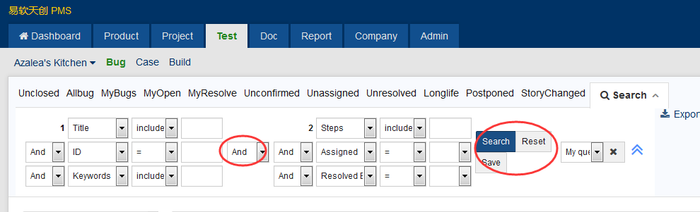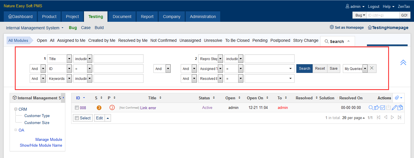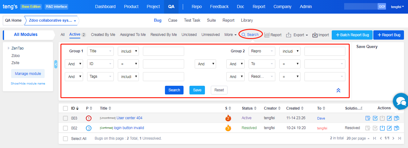 ZenTao has a powerful search feature. You can set multiple conditions to search a bug.