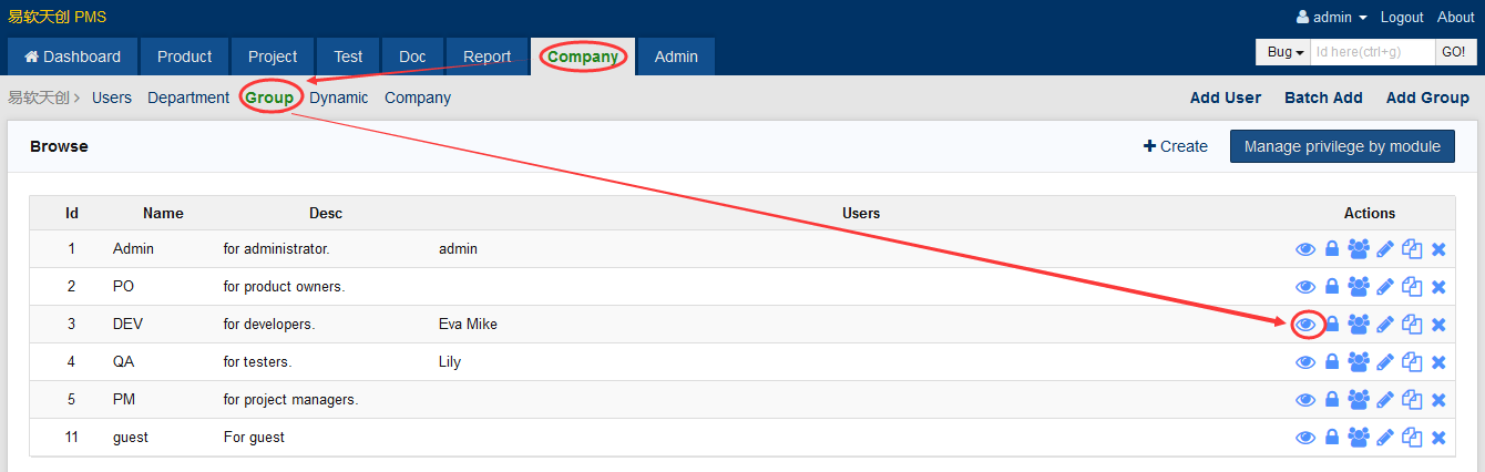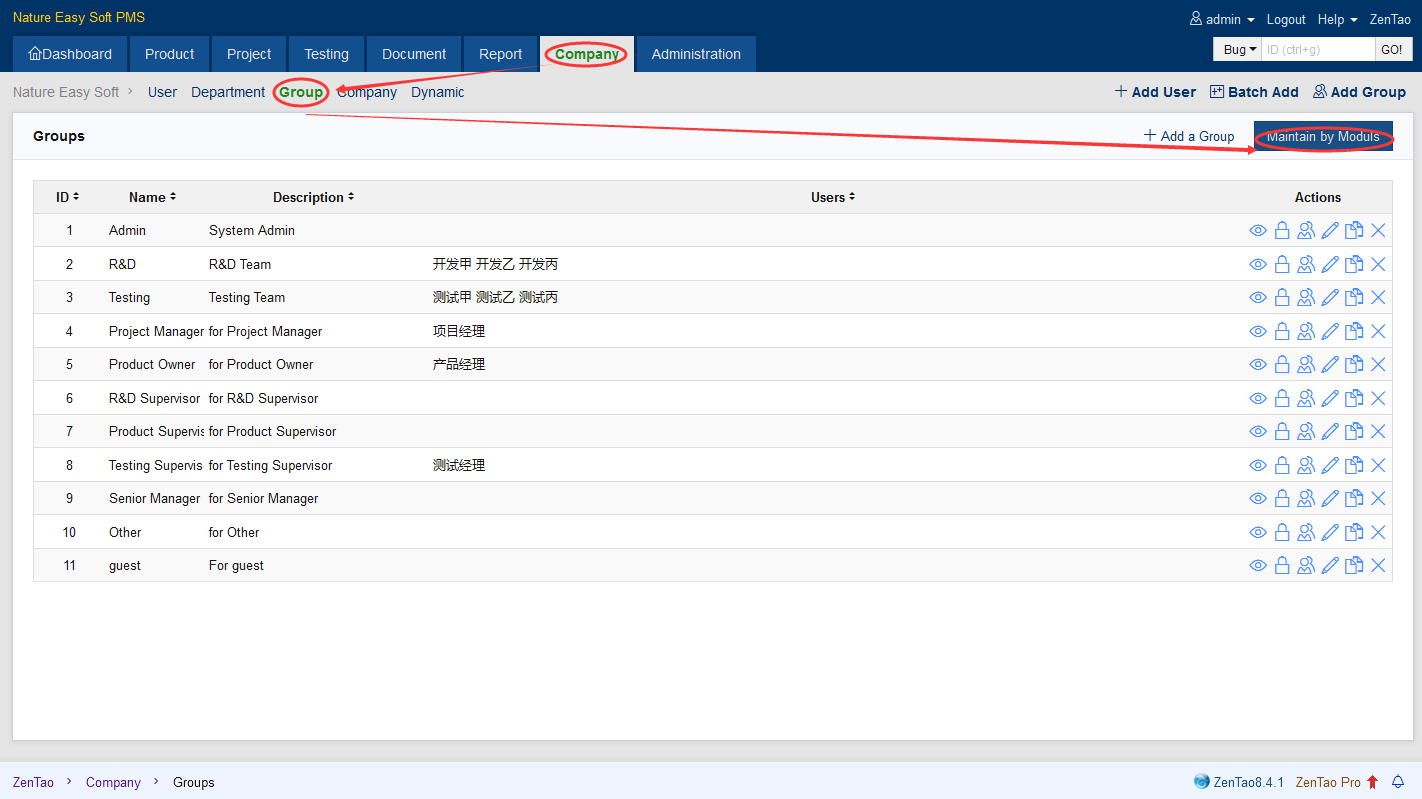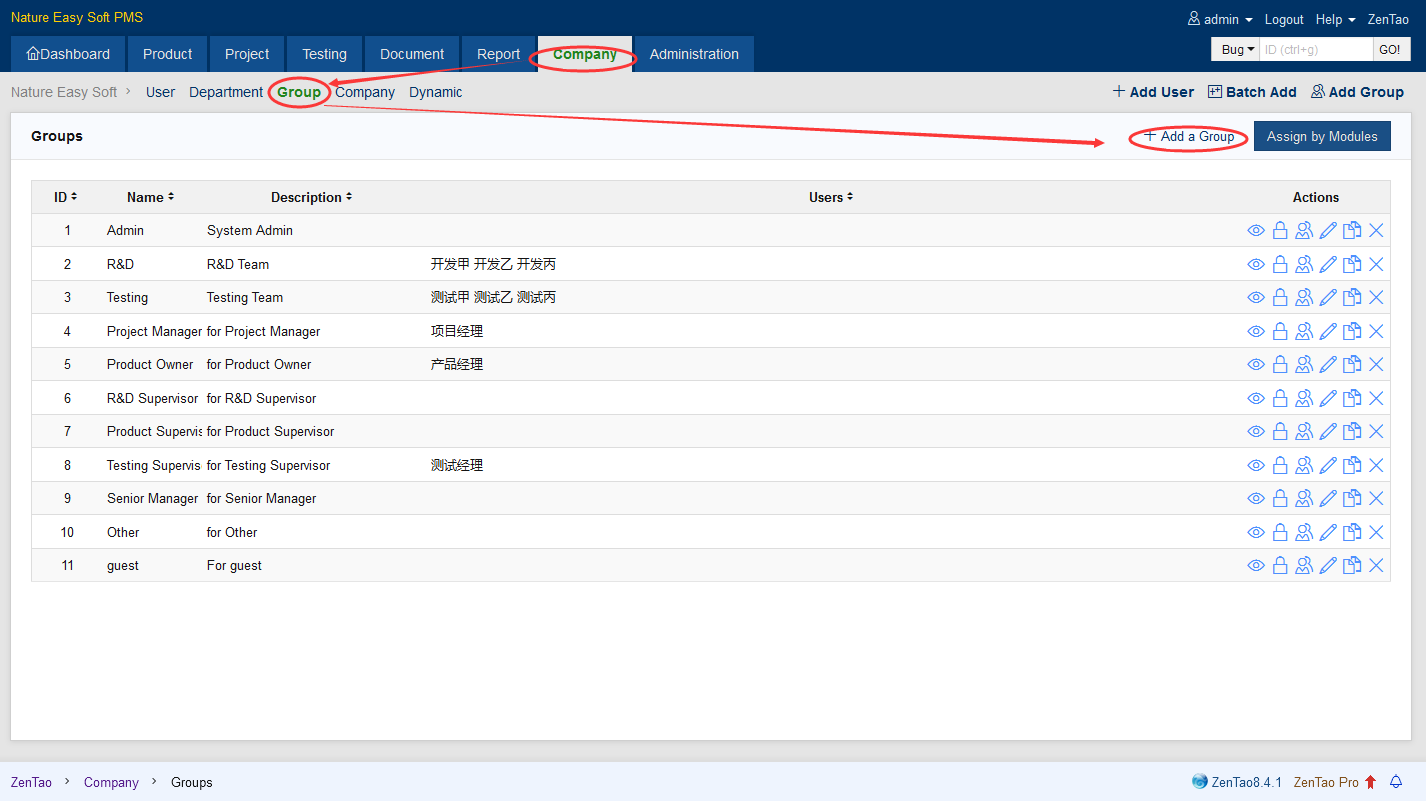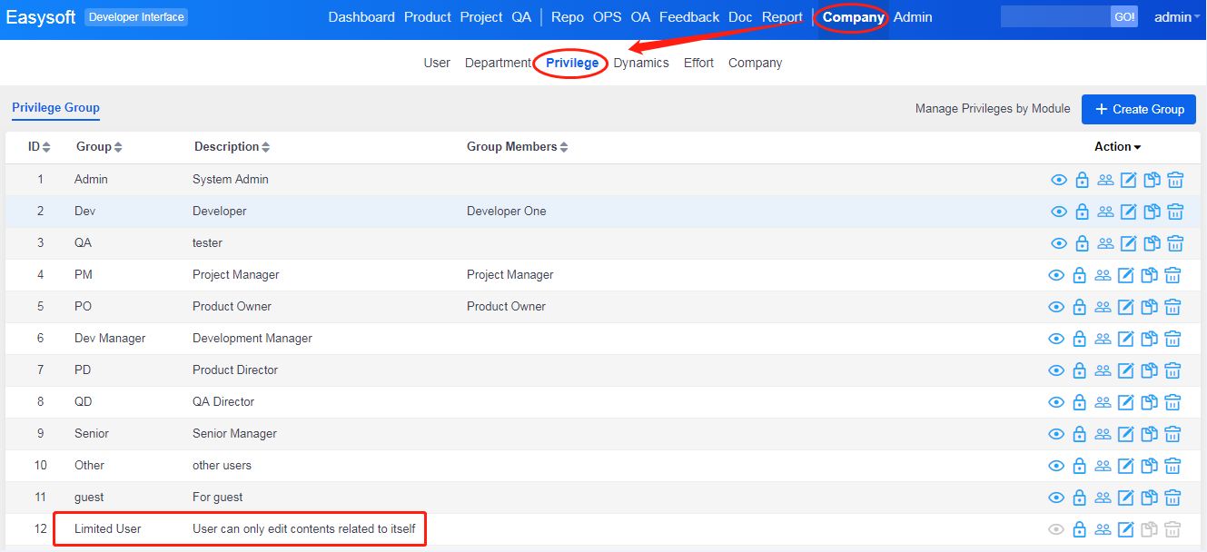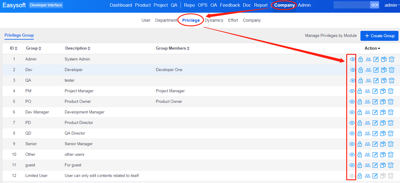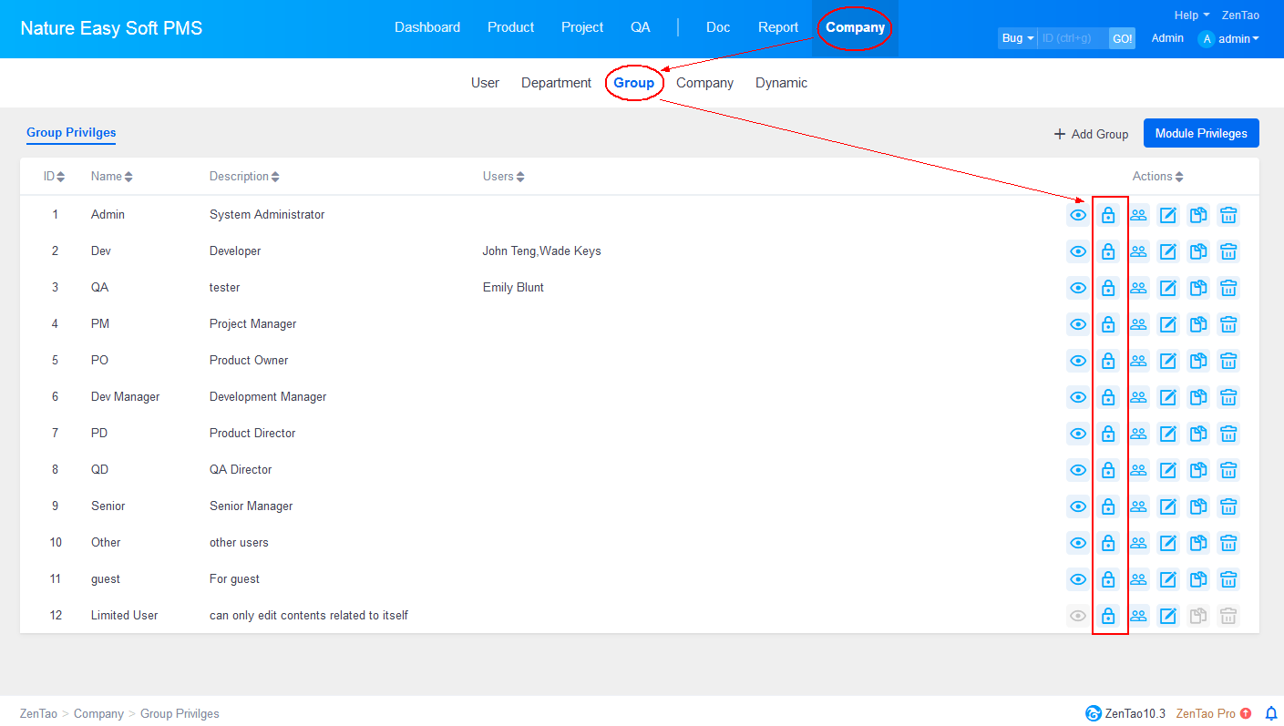1.1 Log in ZenTao as an Administrator and click Company.1.2 Choose Privilege and the page of group lists will show. You will see a few buttons under Action.