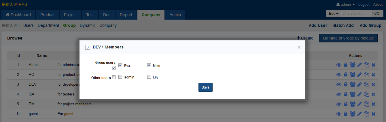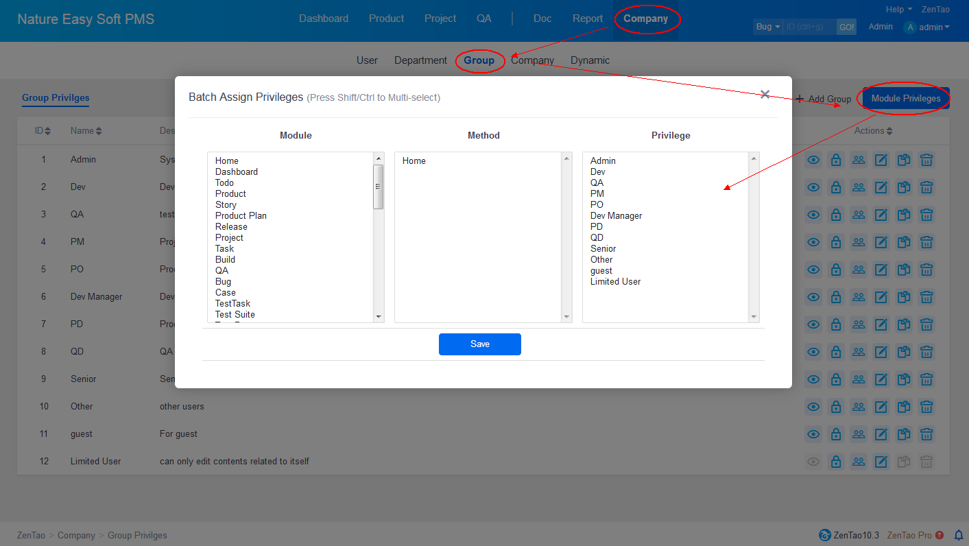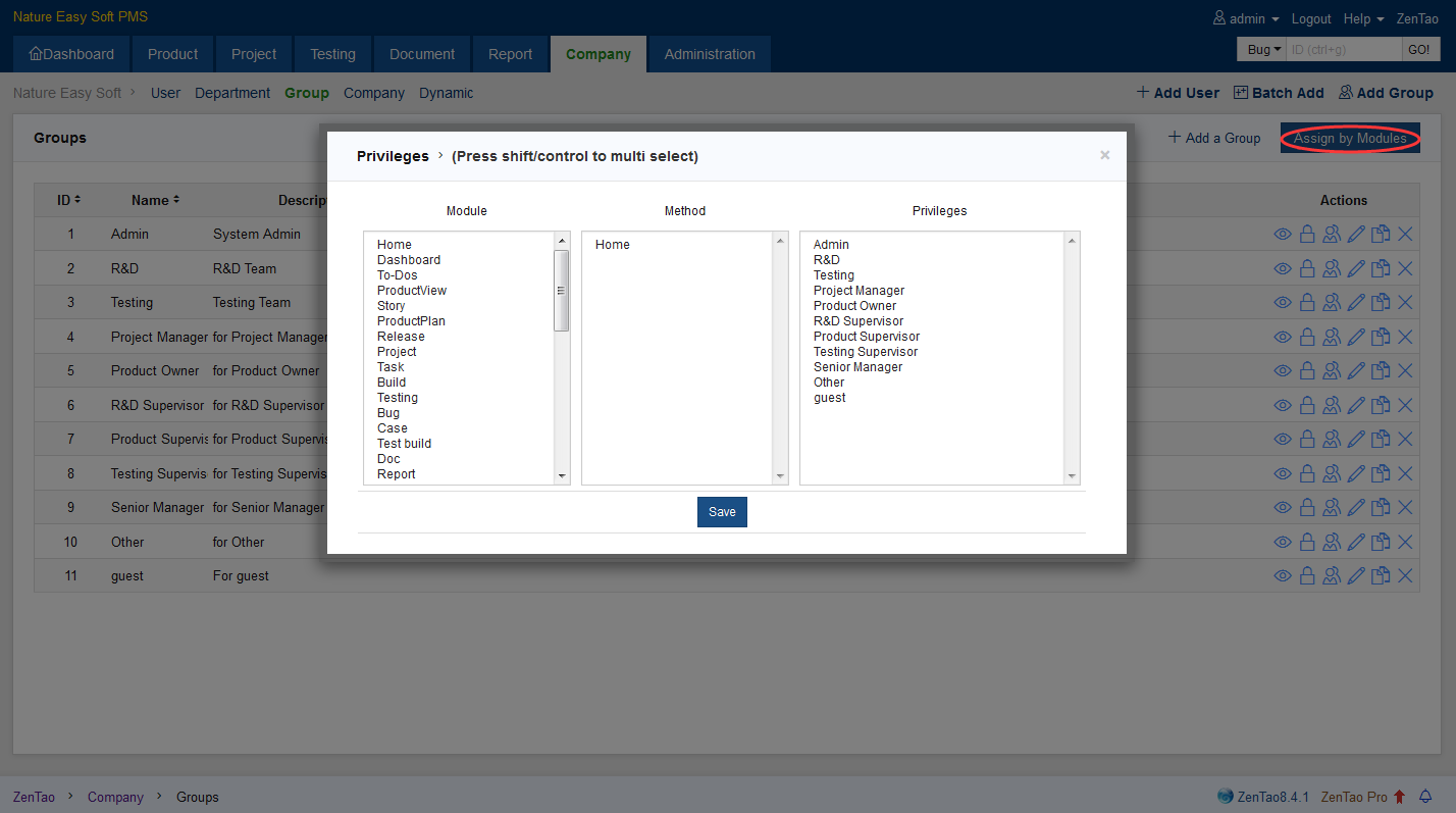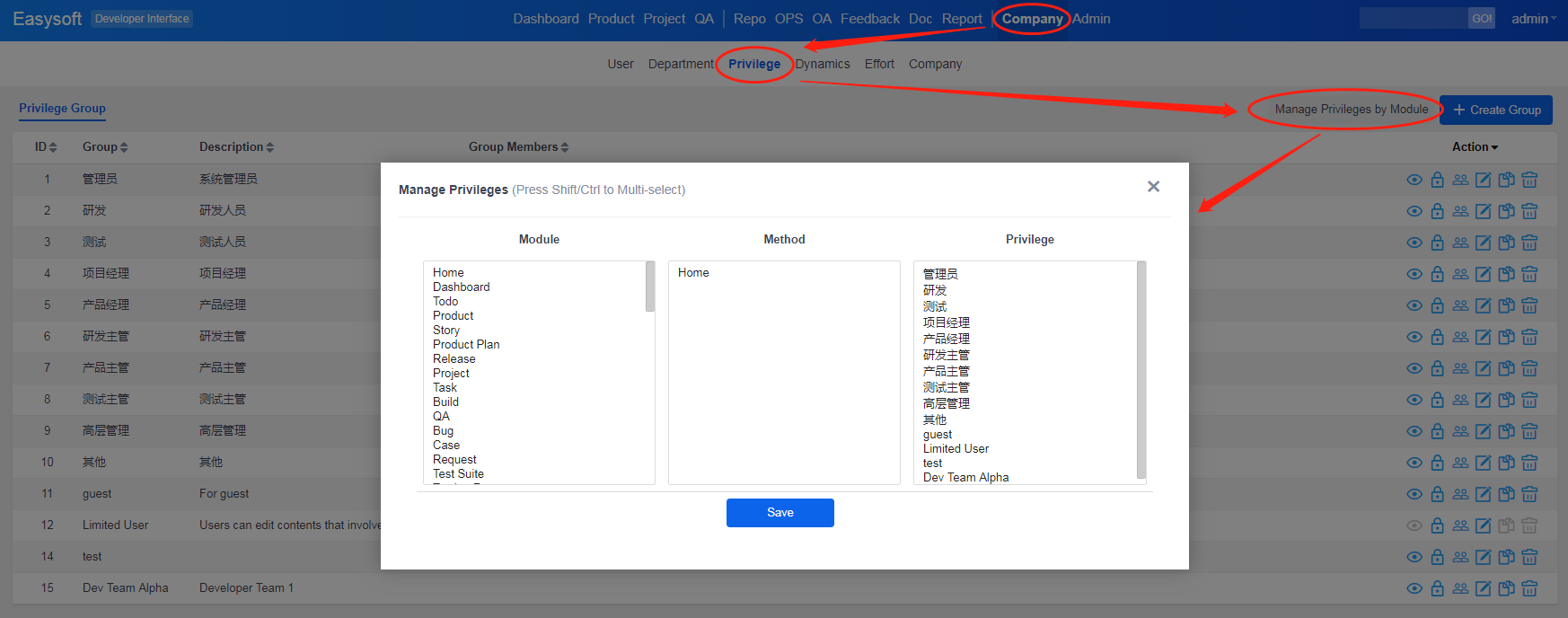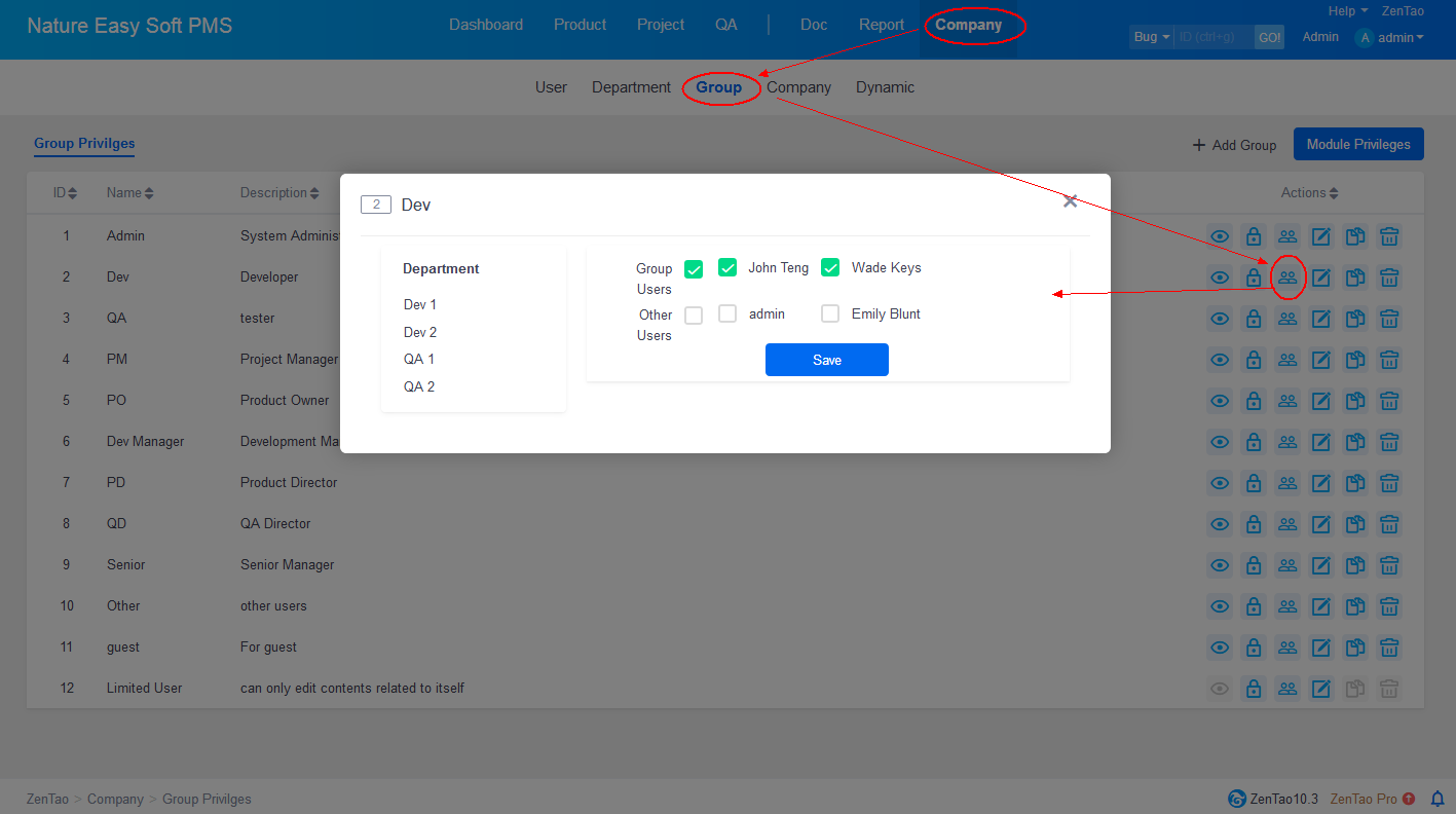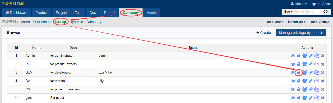 1.1 Log in ZenTao as an Administrator and click Company.1.2 Choose Privilege and the page of group lists will show. You will see a few buttons under Action.
