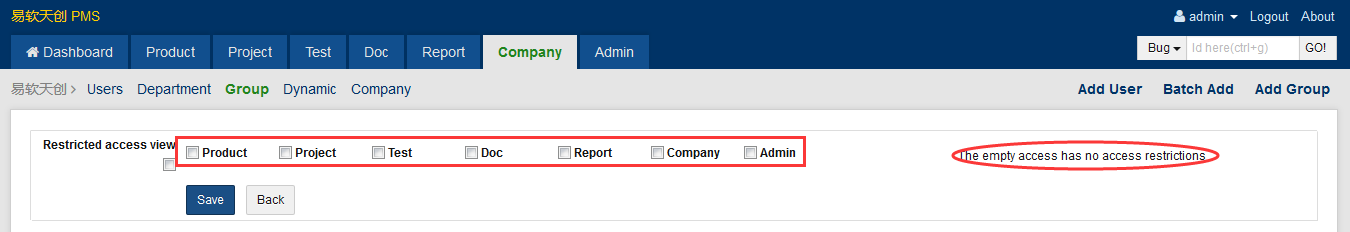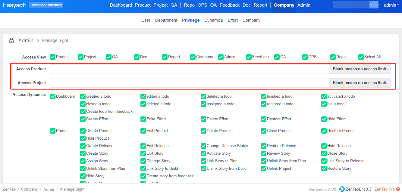 - Allowed Access Sight/View: If you checked all, then the main menu (product, project, QA, Doc, statistic, system, Admin) in the ZenTao navigation bar will be displayed. If you checked none, the navigation bar will not be displayed, nor accessed.