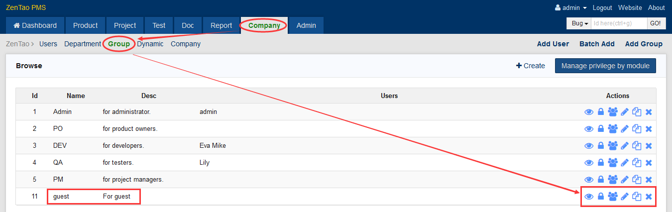 3. Go to Company->Group and you will see a group of guests has been created. Assign privilege as Read Only.