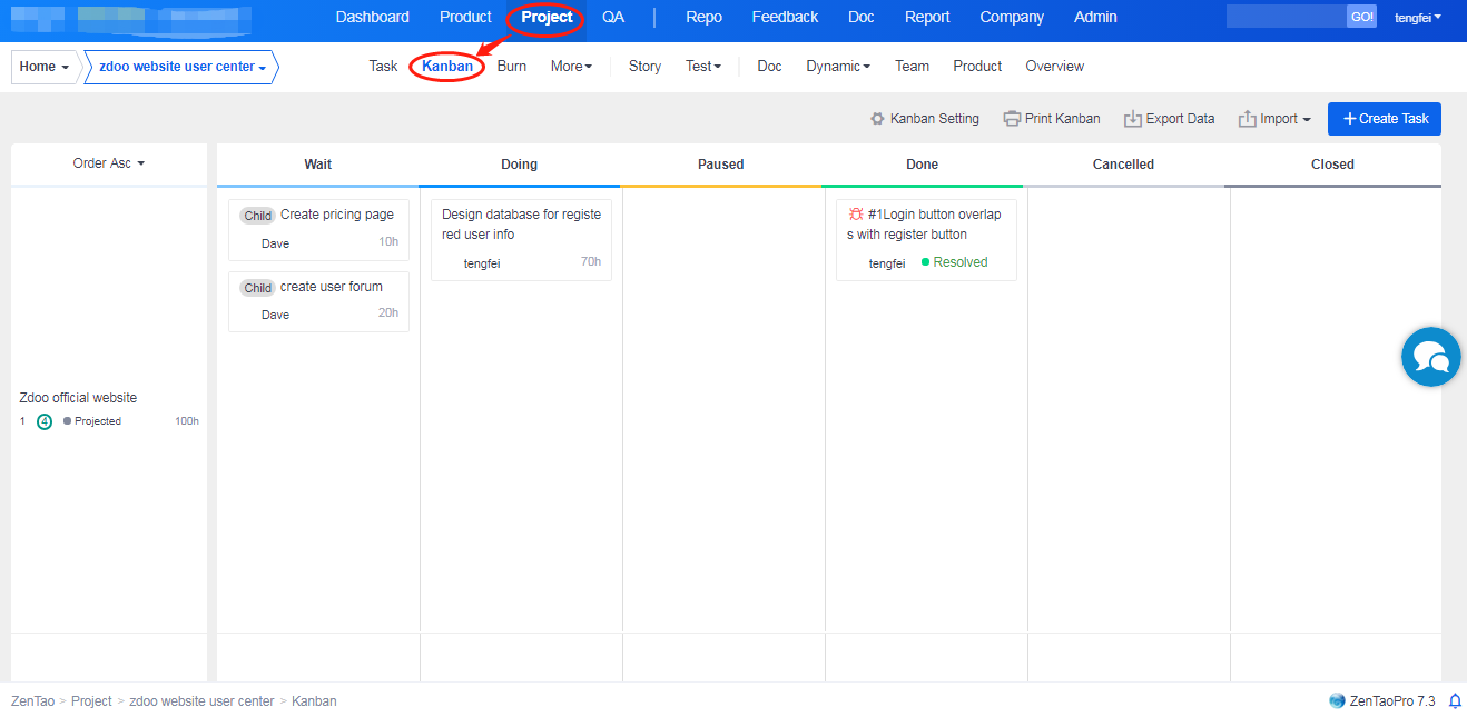Kanban is a standard Scrum tool, but also has limitations. There is a Kanban in ZenTao which is quite similar to a whiteboard. Its main features are as follows.