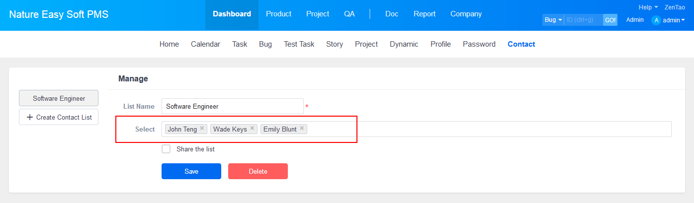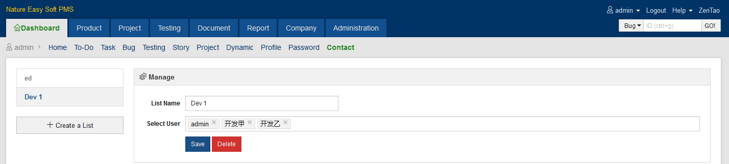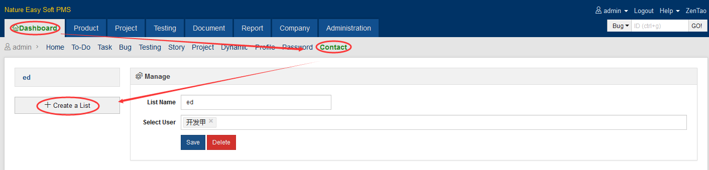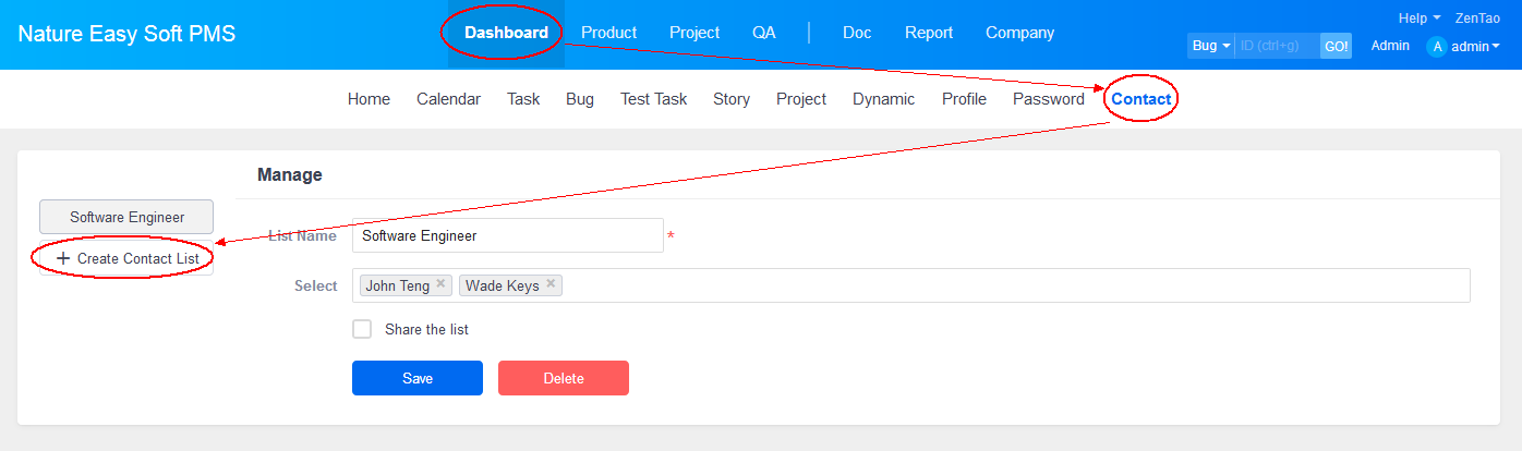 1. Go to Dashboard->Contact and click Create a List. Enter the list name and choose members for this list.