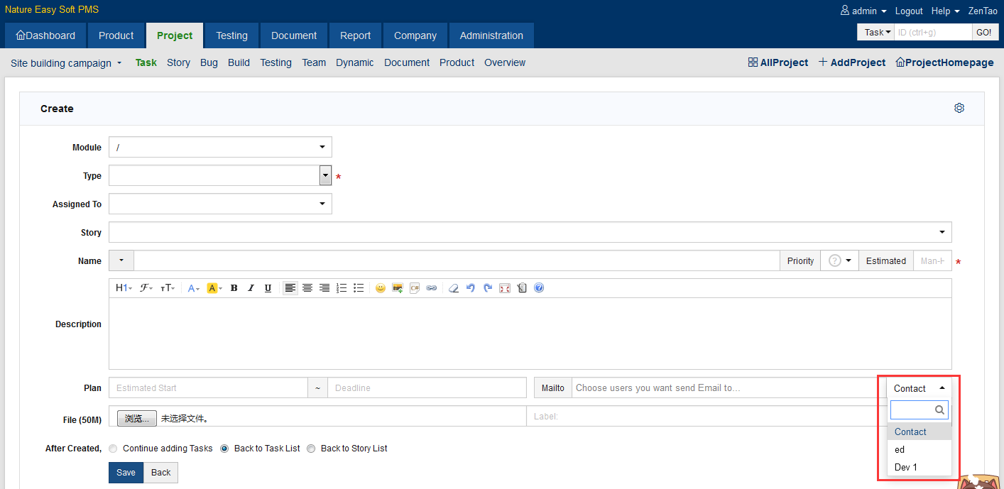 ZenTao users can select a group of members to send notifications to, if there is any update on stories, tasks or bugs. Configure notification email before that can be sent to members. Please refer to 8.2.2 How to Configure your Email.