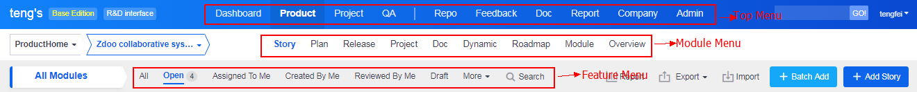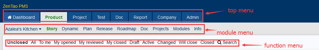 The menu in ZenTao includes three level, the top menu, the module menu and the function module.