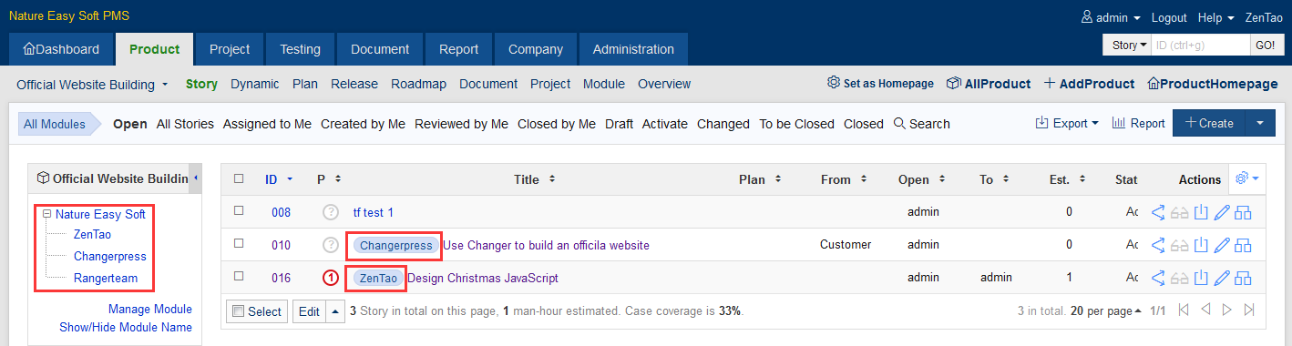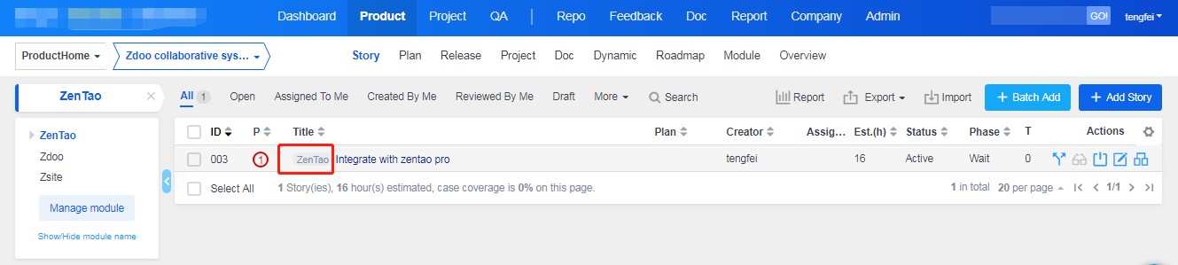 - When creating a task, you can choose a module of Product. Once the task is created, the modules will show. If you did not link any story of the module, you can always link it when creating the task.