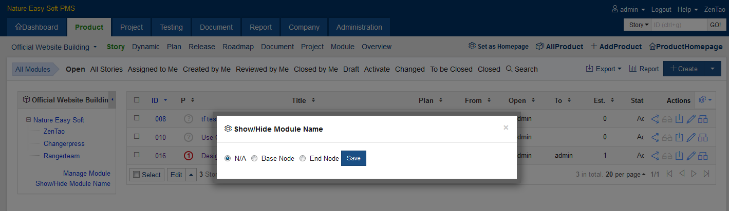 Select Base Node and click Save, you will see the name of the first level module shown in Story List.