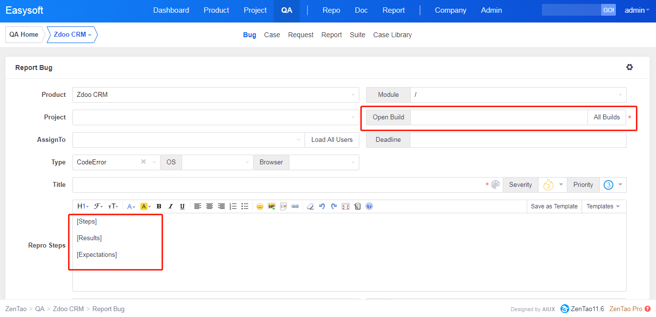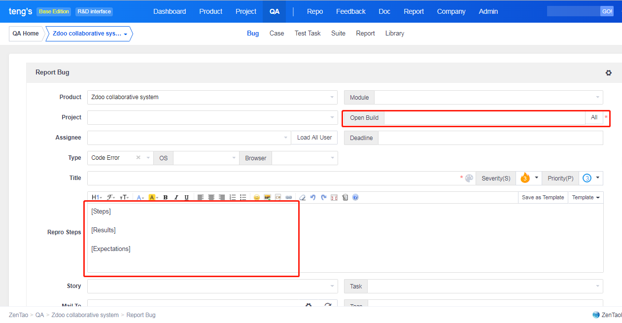 1. Fields of projects, tasks, and relevant stories should be filled carefully, so bugs can be linked to them for statistic analysis.2. A build is a required. The source of the list is a build in the project. If there is no build available to be selected, you should go to Project->Build to create a build that can be linked to the project.