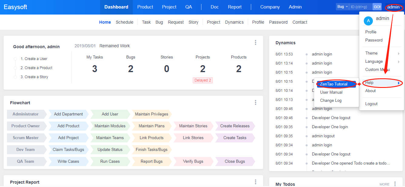 ZenTao Manual and Tutorial for Rookies have been built in Zentao. You can refer to it when you have questions. Click "Help" at the upper right of ZenTao, and you will find it there.