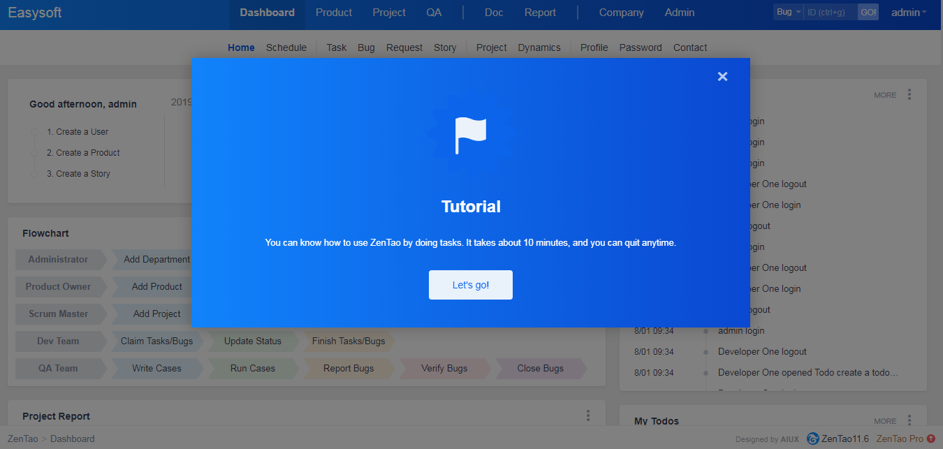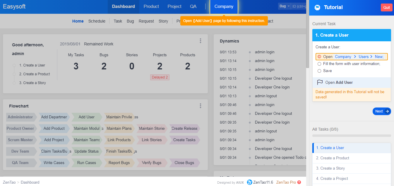 ZenTao Tutorial for rookies has been added to ZenTao 8.2 Beta+. It will guide you how to use ZenTao in a simple way by doing eight tasks.
