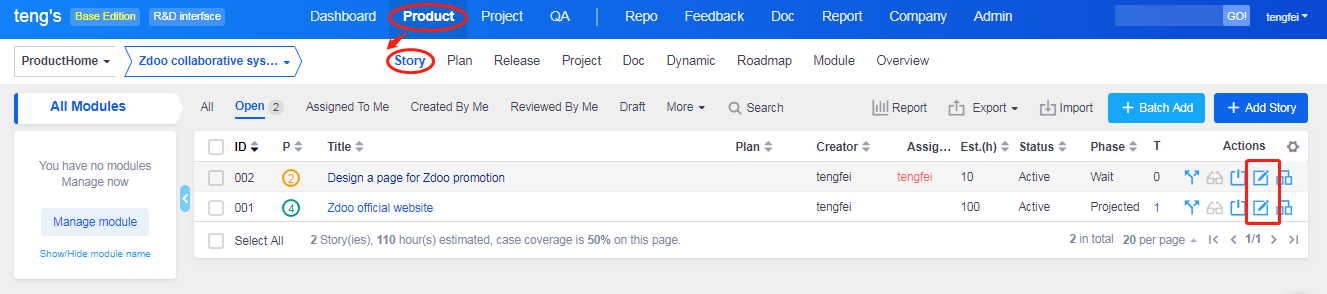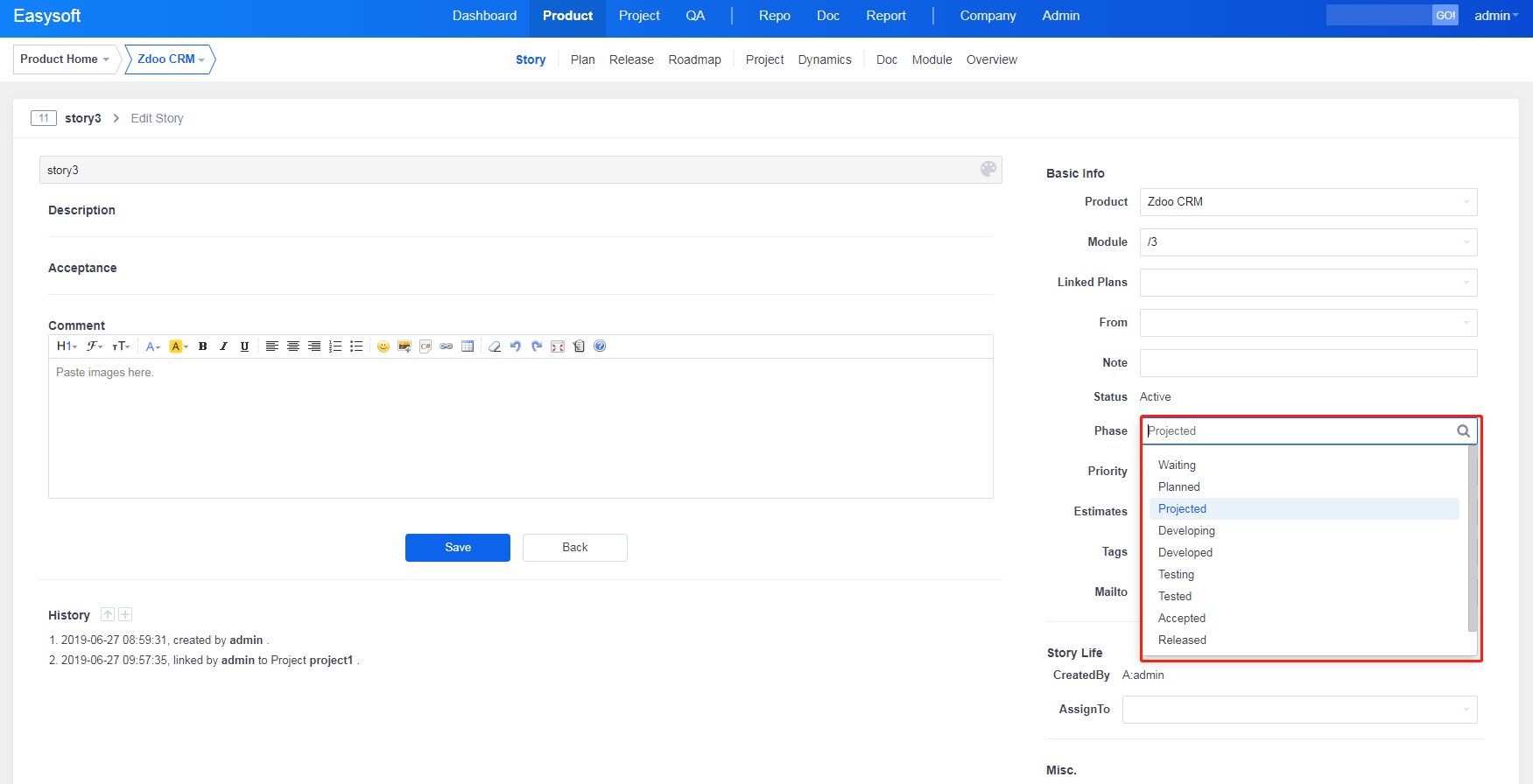 There are two fields in ZenTao to track the changes of stories. One is Story Status and the other one is the Phase of a project. Now, let’s take a look at the two fields in details.