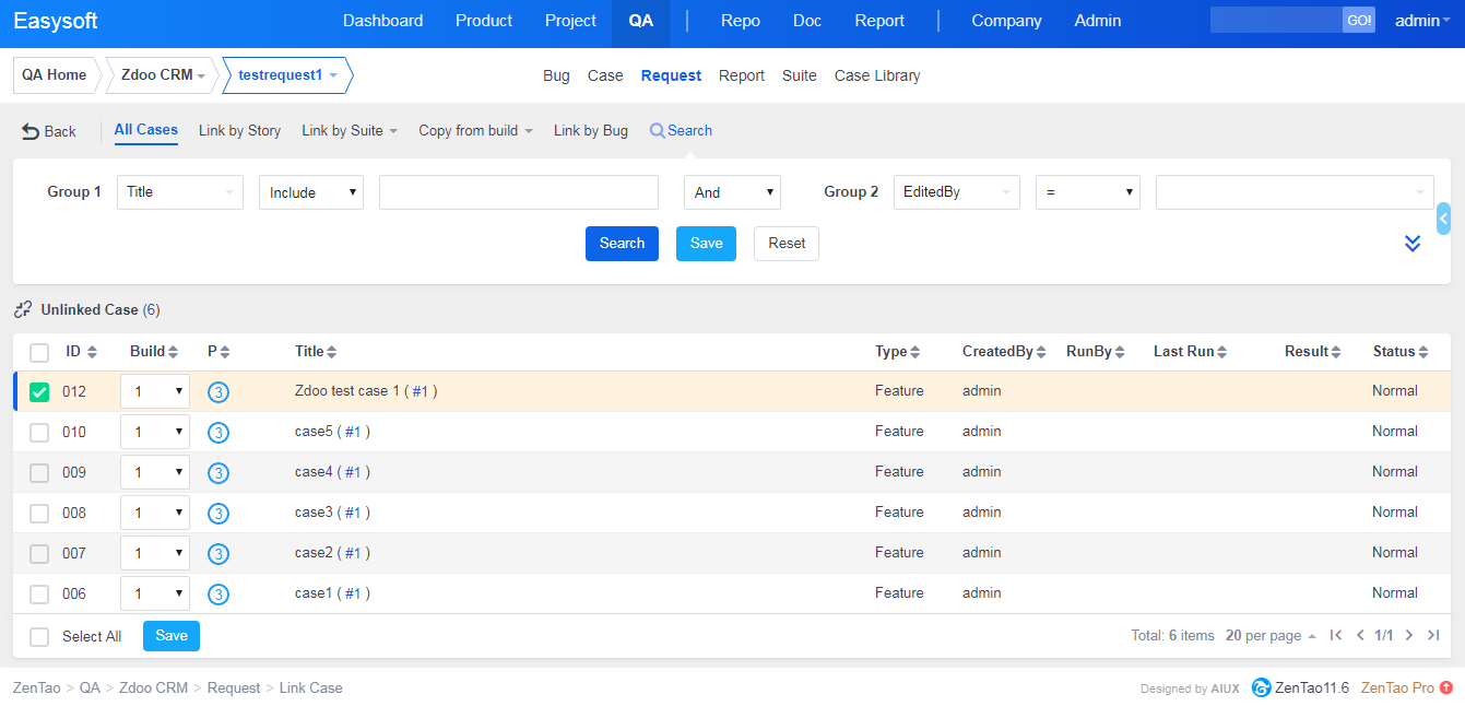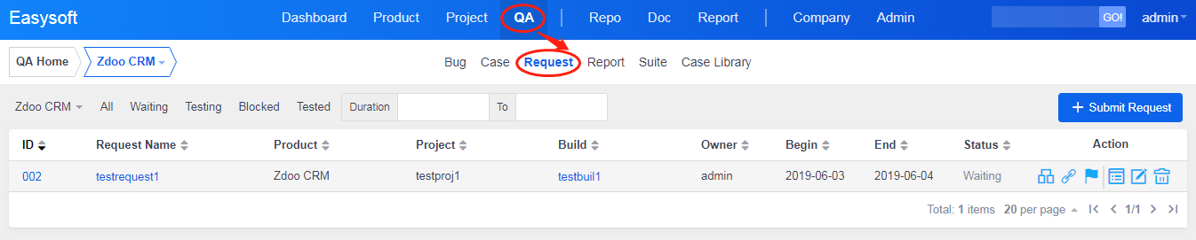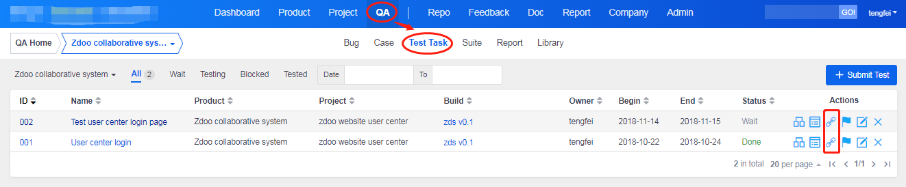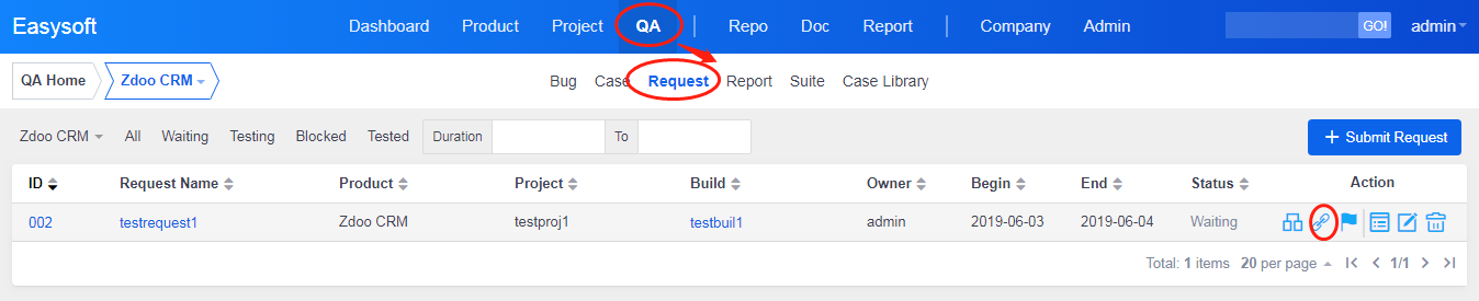 Go to QA->Request and you will the page of build list. Choose a Build to be Tested, and click the Link button.