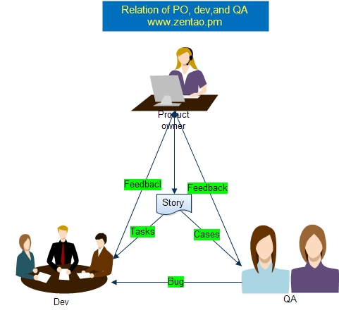 In ZenTao, there are three key roles, Product Owners, Development teams and QA teams. The three roles cooperate with each other through stories, representing the Tripartite in project management. Product Owners gather stories; Development teams perform tasks, and QA teams guarantee qualities. Their relations are shown as below,