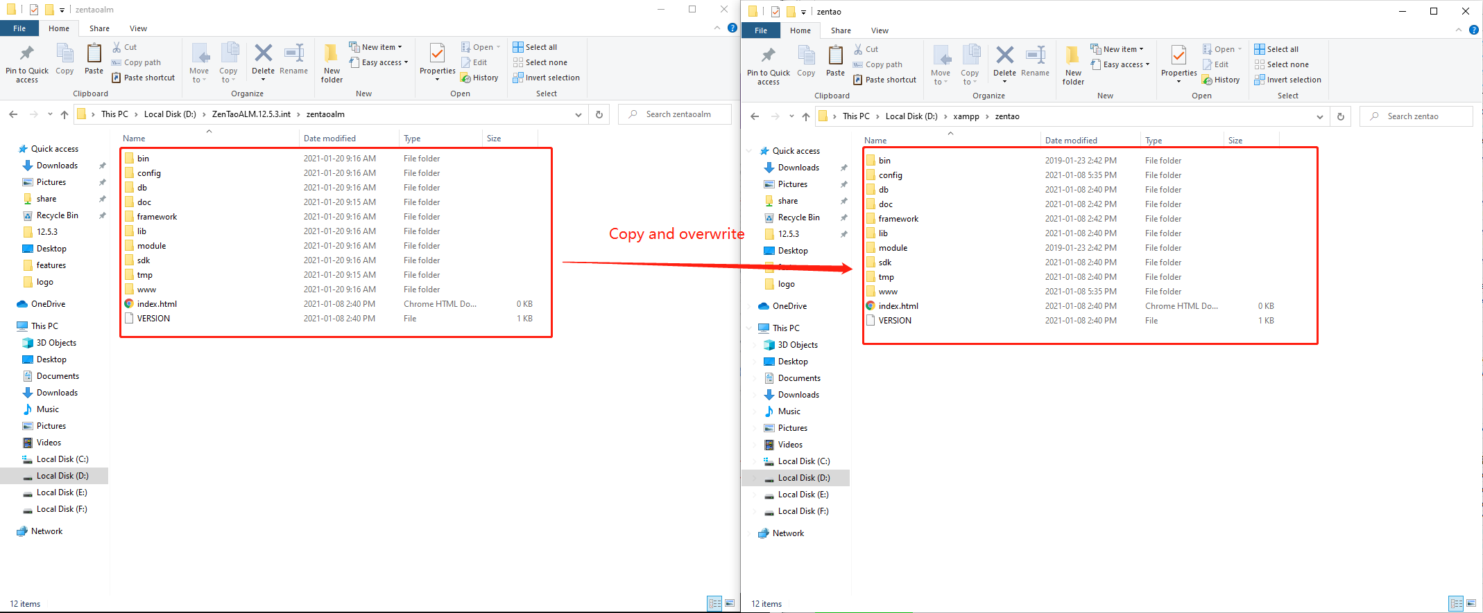 1.1 Download the latest package (.zip file). (Note: Do NOT download .exe file to update ZenTao, or all the original data will be overridden).1.2 Unzip the package to / xampp / zentao. For example, if it is in the directory c: / xampp /, then unzip the source package to c: / xampp / zentao and override all the data and files in this directory. Copy all the files in zentaoalm / to xampp/zentao/.