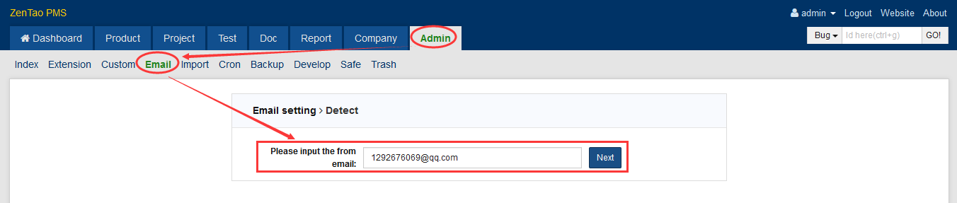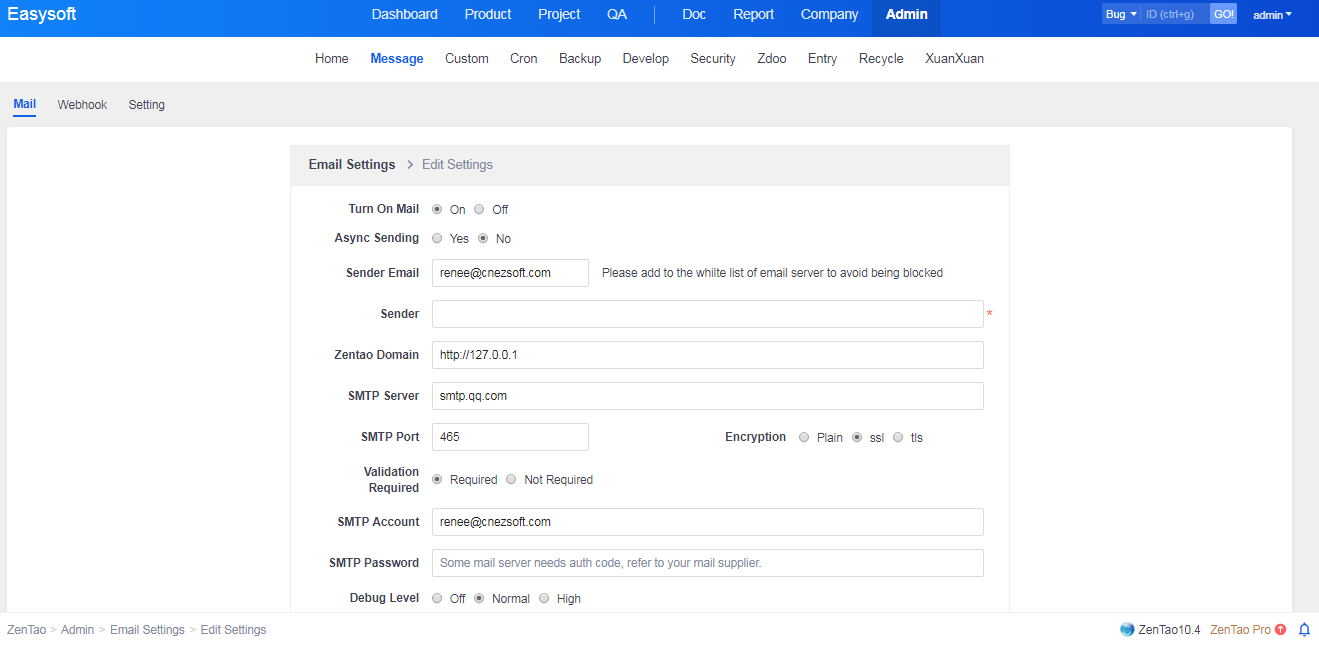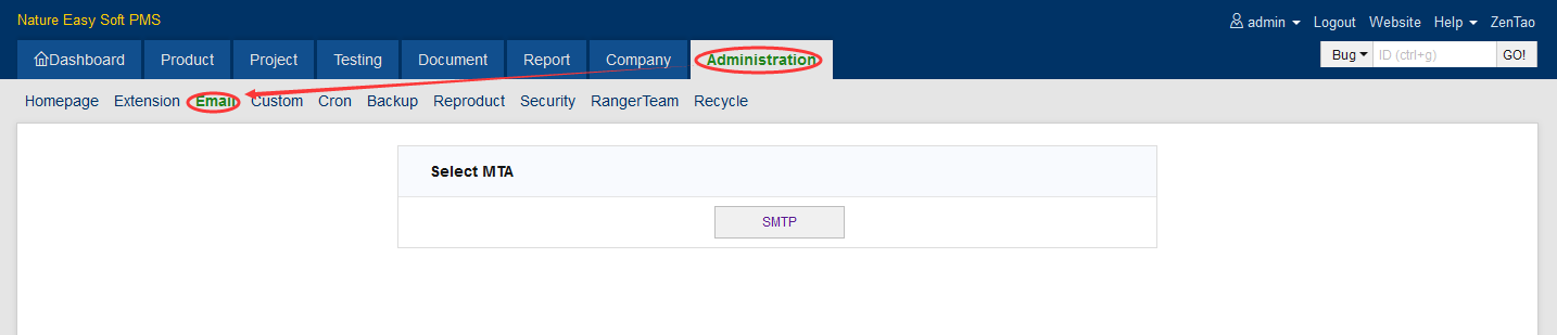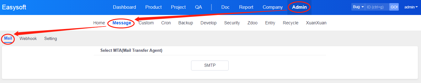 1. Log in ZenTao as an administrator.2. Click "Admin" ->"Message"->"Mail" to set up.