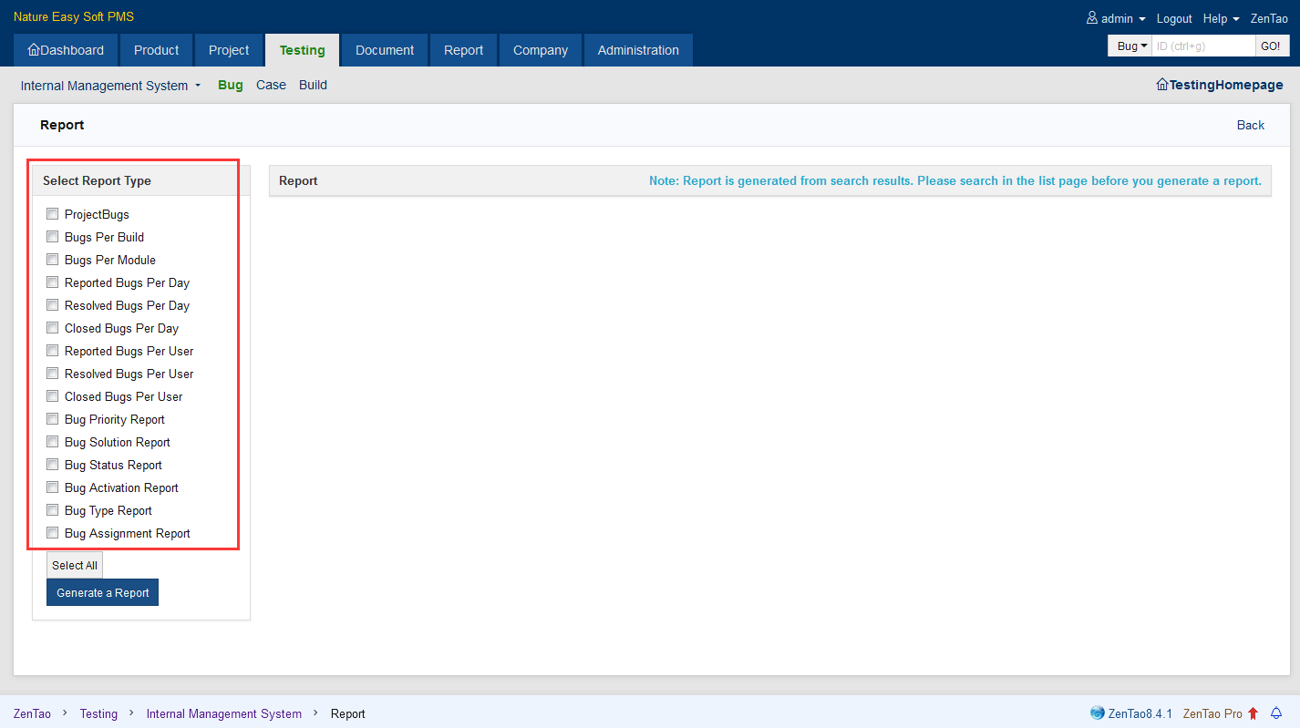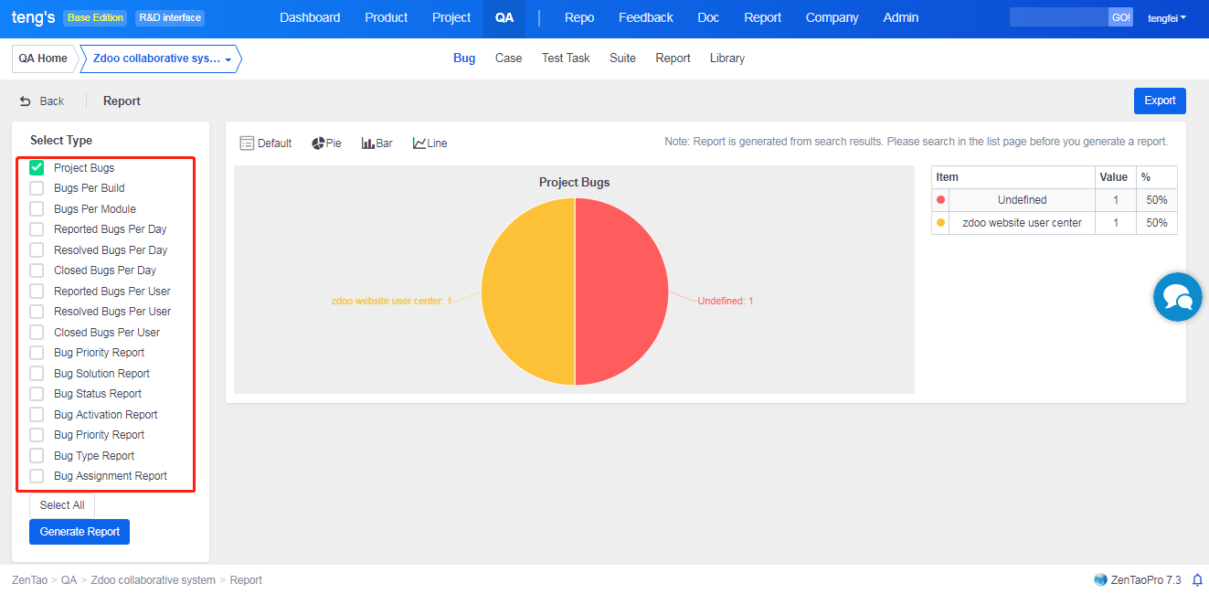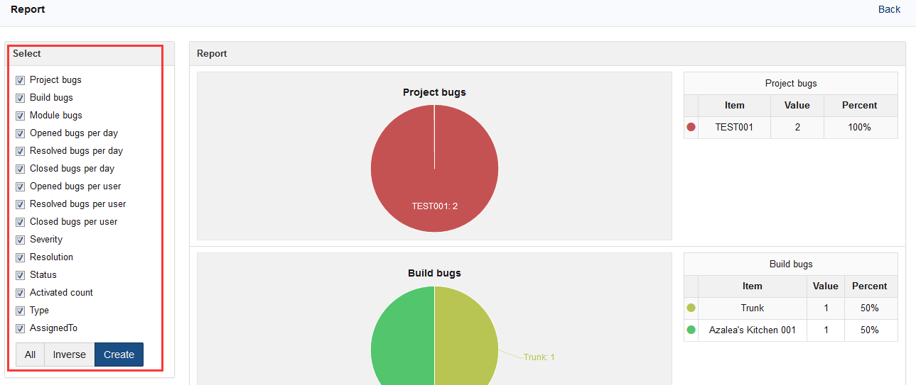 The report on bugs is related to current lists. Therefore, you can search the bug lists you want to generate a report of by different search conditions.