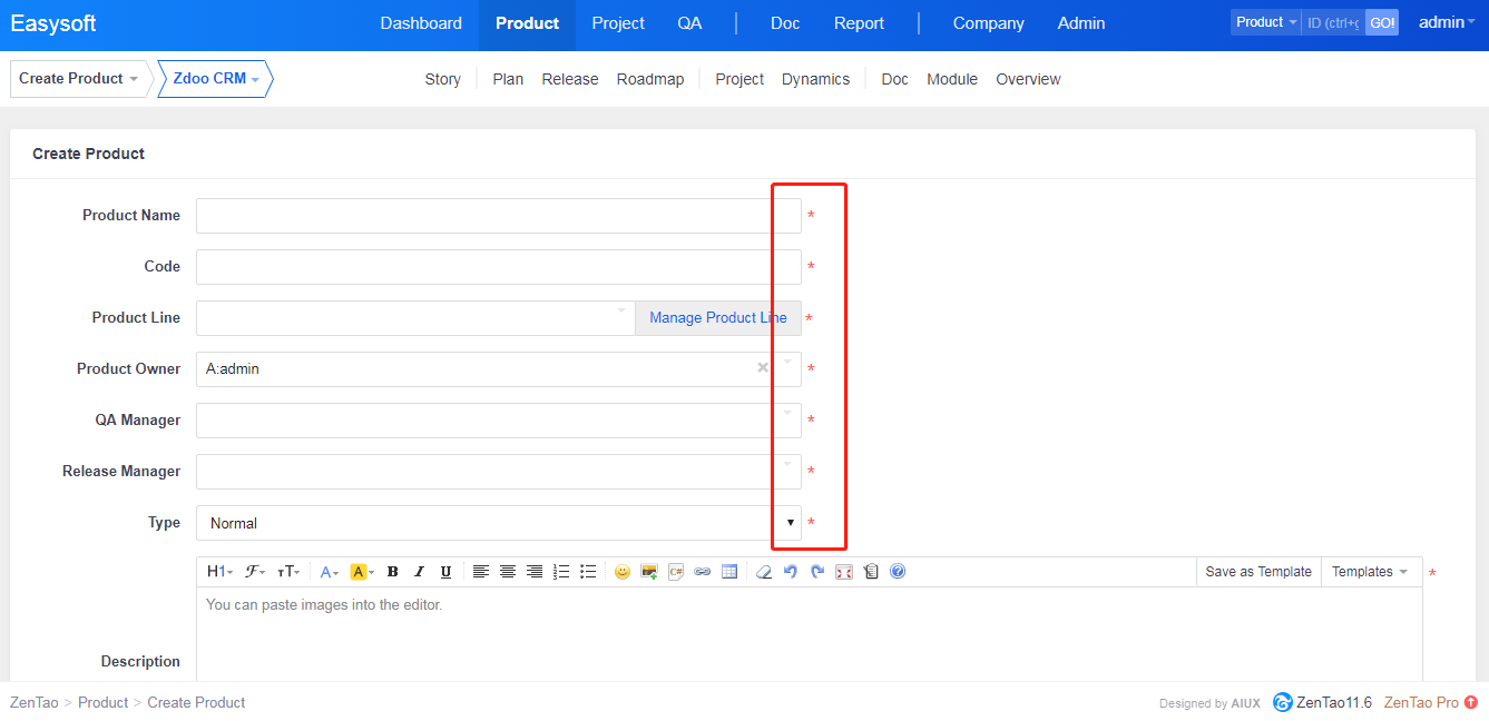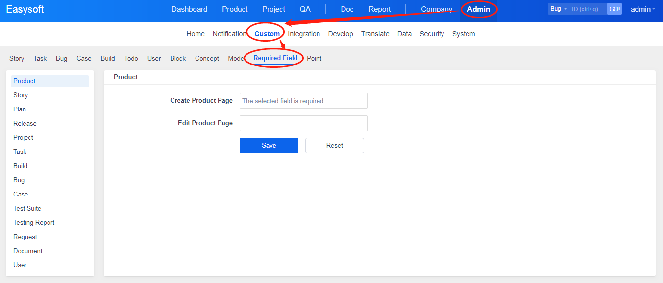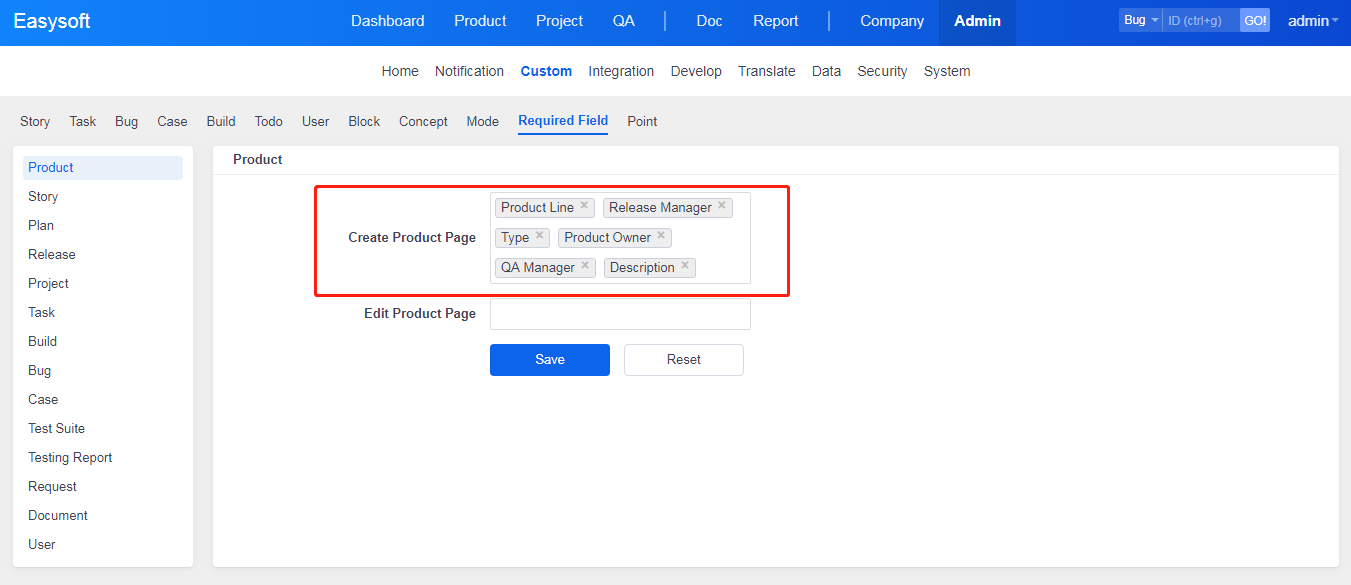 Let's take Create Product as an example to see how to set required fields. Firstly, set Product Line, Product Owner, QA Manager, Release Manager, Type, and Description as required fields when Create Product. Then click Save. Note: The required fields by default, such as Name and Alias, cannot be deleted from required fields.
