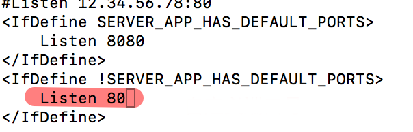 c. Search "Listen 80" and change it to another port number (don’t conflict to other service port number). Then restart Apache.