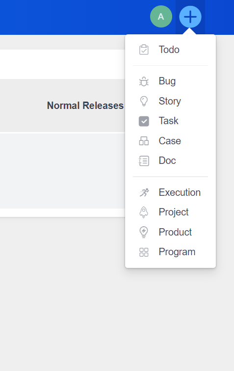 - The global add function is added to the right side of the secondary navigation, including to-do, bug, requirement, task, use case, document, execution, project, product, program set, etc., which is convenient for users to perform quick operations and reduce operation paths;