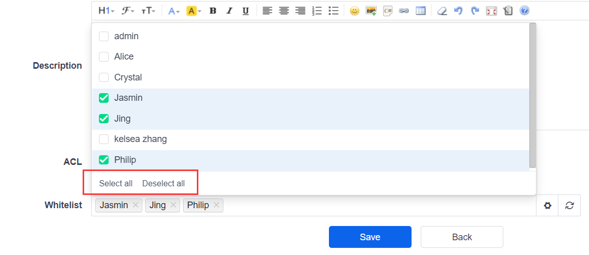 - Buttons "Select All" and "Deselect All" are newly added in the multi-select drop-down boxes.