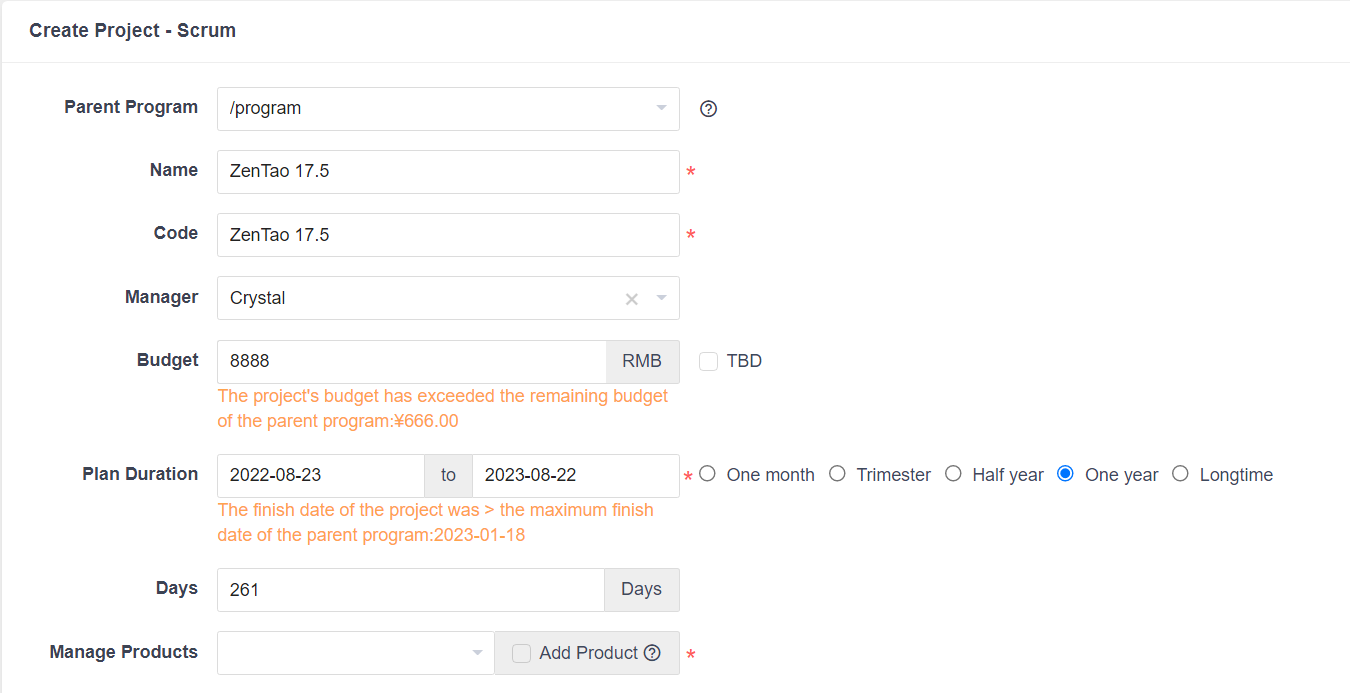 ▼ Cancel the parent program's restrictions on project budget and time range, for your convenience to set the time according to the actual needs freely. You will be prompted when it is exceeded, but you can still save.
