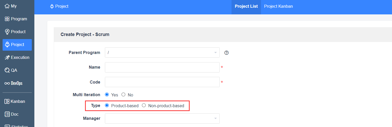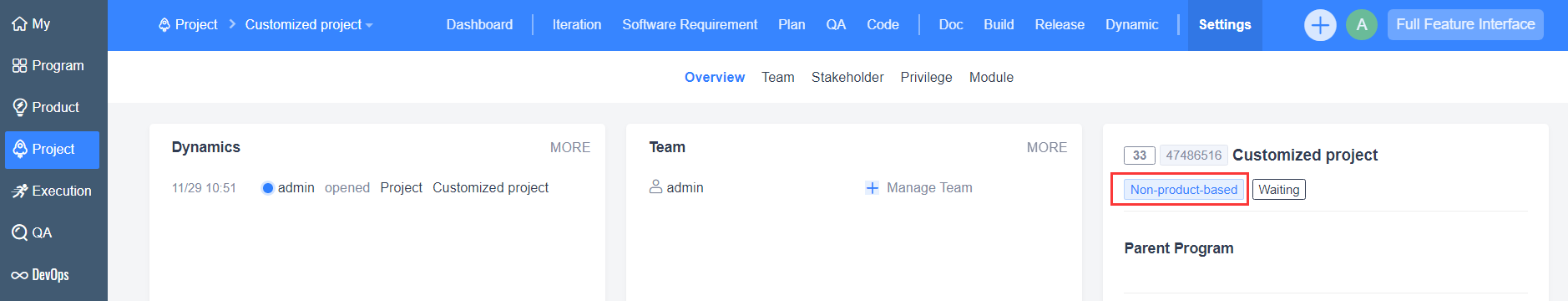 ▼ Under the scenario that users manage a customized project, there is no need to bind a product. So we add an option of "Non-product-based project" for users, which is convenient for them to manage stories and tasks under a certain project without creating any products.