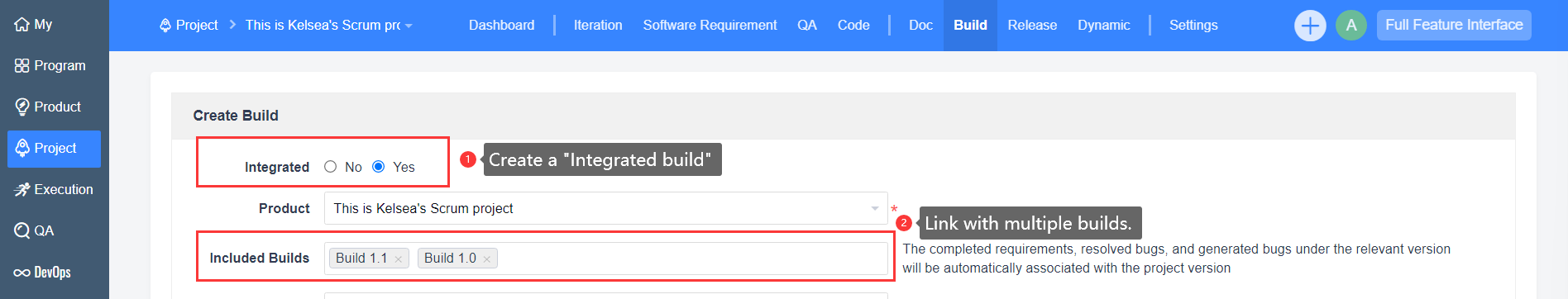 - It is supported to create integrated builds under a project, which allows users to link multiple builds under the iteration.