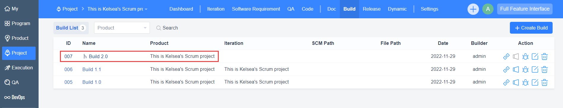 ▼ It is supported to create integrated builds under a project, which allows users to link multiple builds under the iteration.