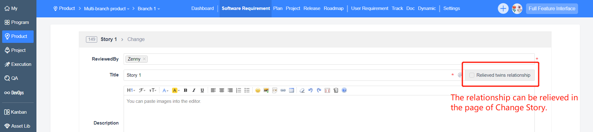 - It's supported to create twins stories for the multi-branch/platform products, and the story descriptions will be kept same.
