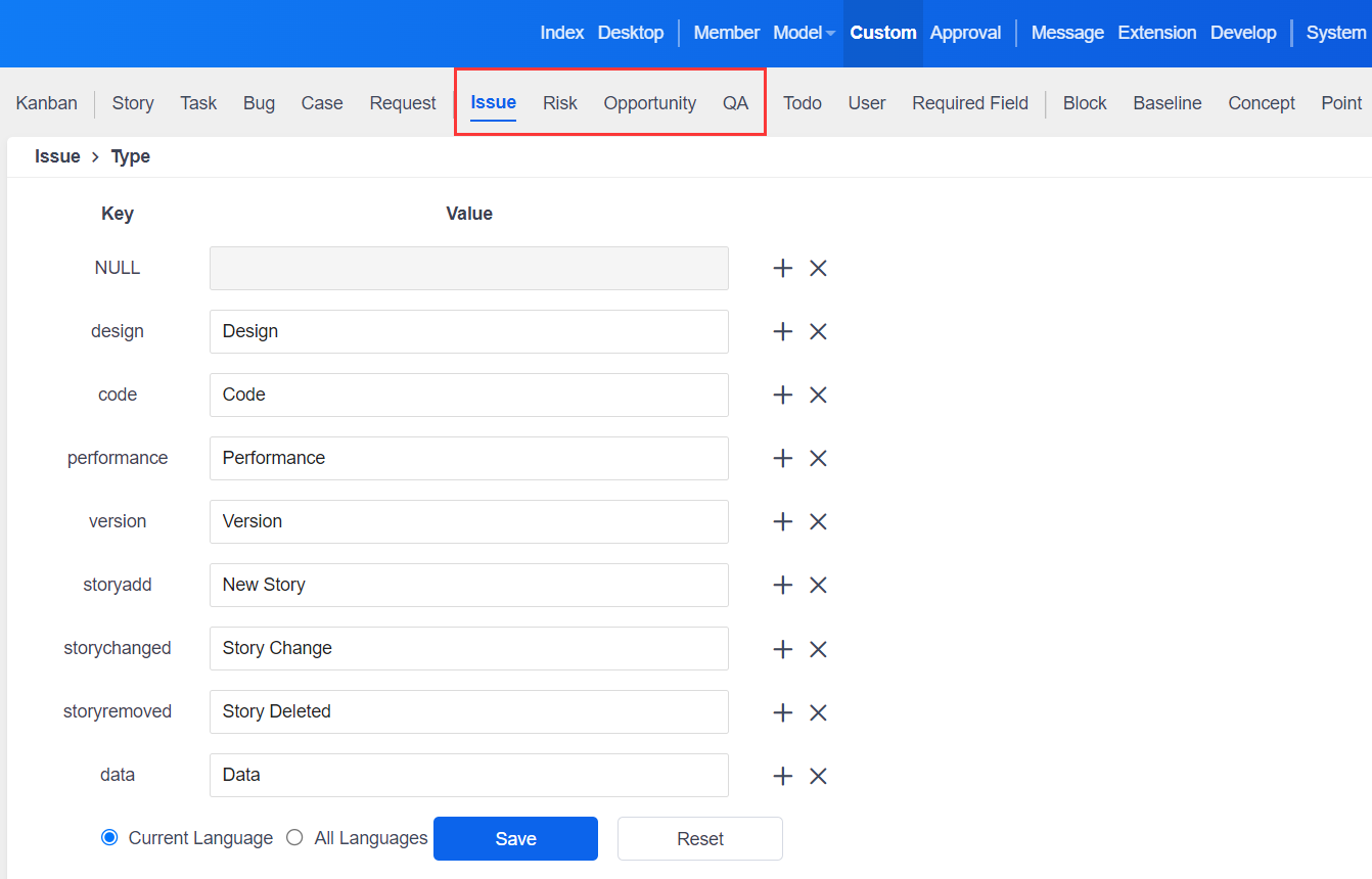 ▼ Issue, Risk, Opportunity, and QA can be customized in Admin.
