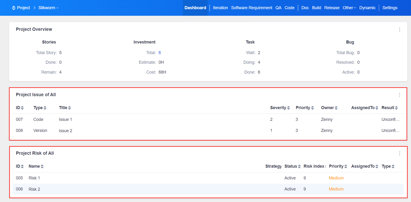 - Blocks of Issue and Risk are newly added to the dashboard of Scrum projects.