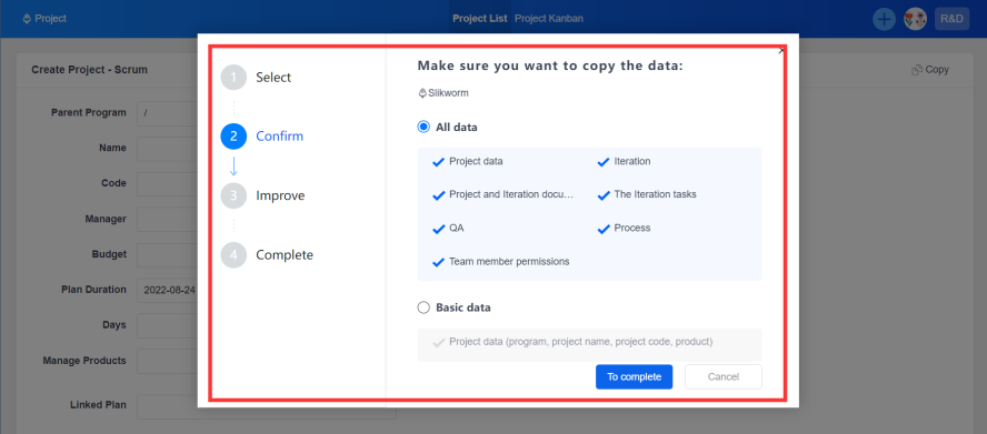▼You can copy more information while copying the project such as iterations, stages, and tasks.