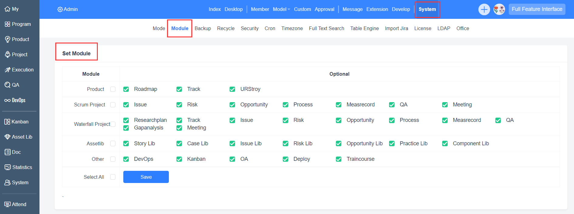 ▼ ZenTao deeply supports the implementation of CMMI 3 with various features. For some features if you don't need, just go to Admin to disable them.