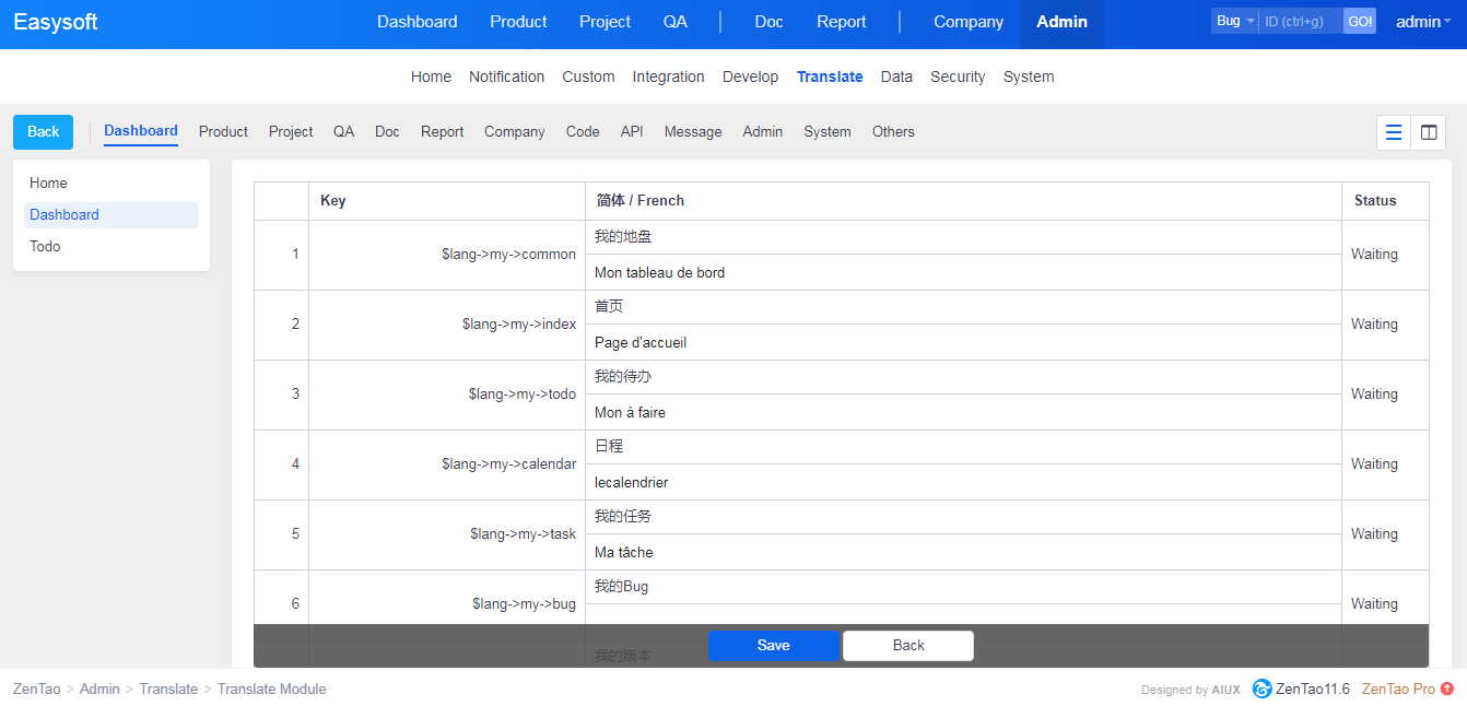 Translate English ZenTao to other languages.This extension is to translate language for each module in ZenTao. Users can translate ZenTao in the language they want by using the Translation feature. Reference language is the language that the translation is referred to. After the translation is done, other users can review it. The translated language files can be exported and the information of the translator, the reviewer, and the review date and time will be included. The latest version adds new features: 3.This version fixes some bugs. And support the export and import of language packs