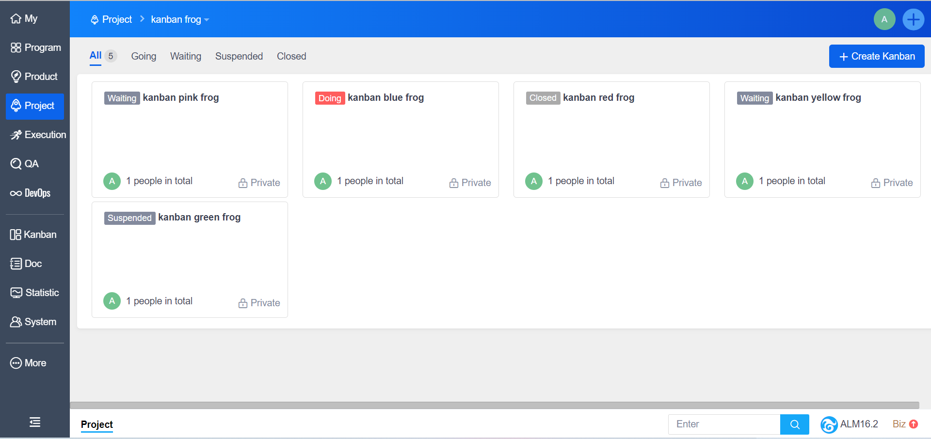 Hello everyone! ZenTao 16.2 is released. Professional R&D Kanban function at the project management model level is added in this release. ZenTao is going to fully support the three project management models: Scrum, Waterfall, and Kanban from now on. Users have more flexible choices with the more completed features of ZenTao.