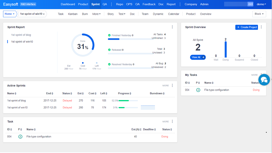 - Project management: project, Sprint, task, build and burndown chart