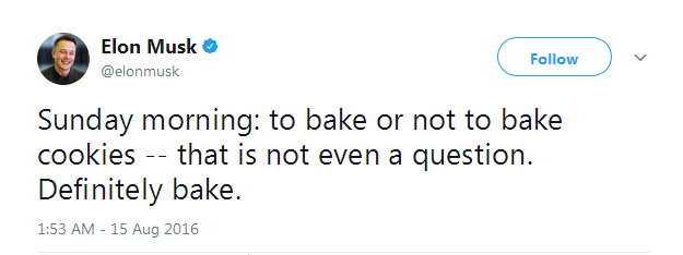 According to raywenderlich.com, 28.1% of survey respondents chose cooking as a hobby. SpaceX and Tesla CEO Elon Musk tweets often and generate a lot of speculation about future projects, or even...baking.