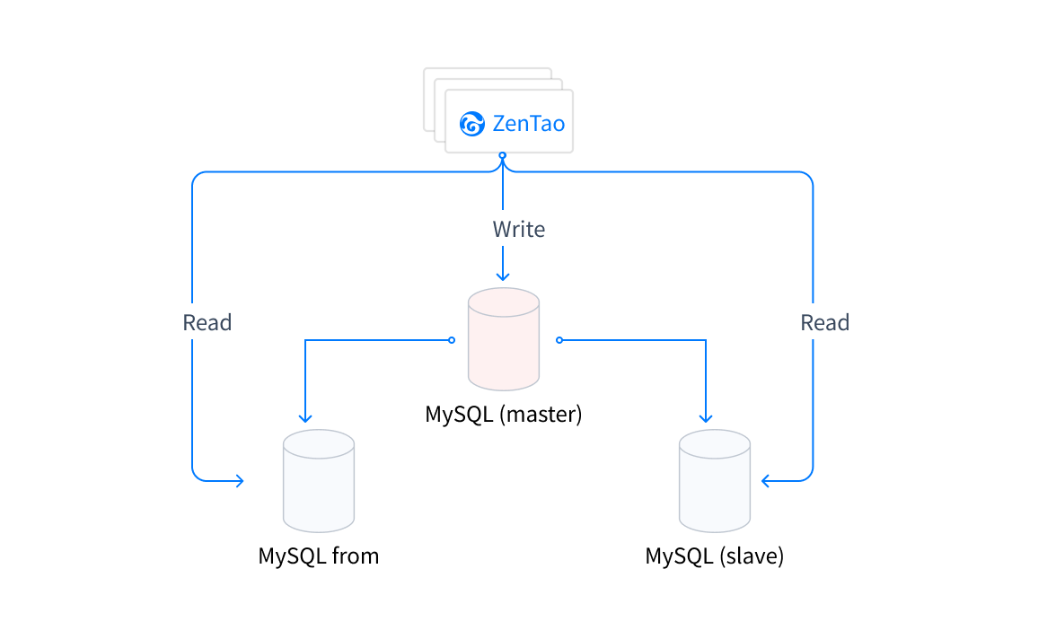 ZenTao supports read-write separation, with the master database handling all read and write operations, while the slave database is read-only.