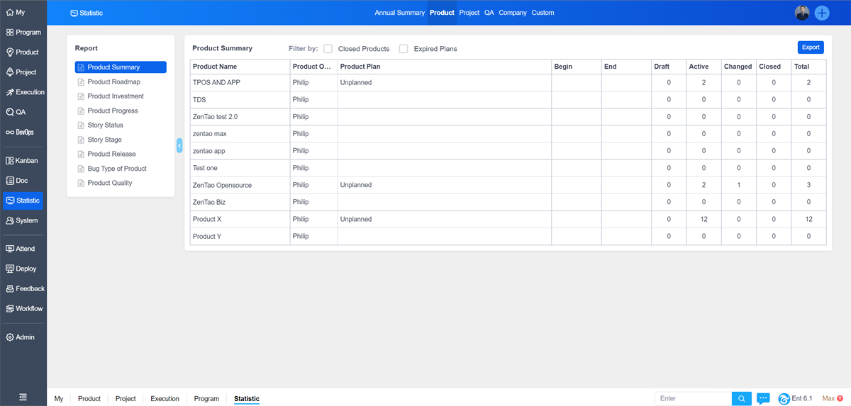 In the statistics view, you can summarize the data of products, projects, tests and organizations, and present the data from multiple dimensions through reports.