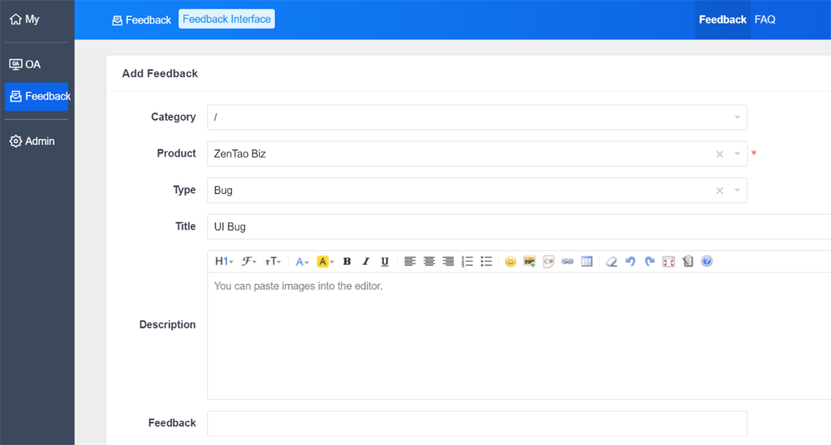 The feedback function of ZenTao Biz can be used to manage the after-sales service and technical support of delivered products.
